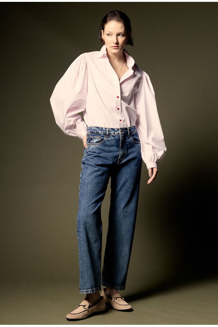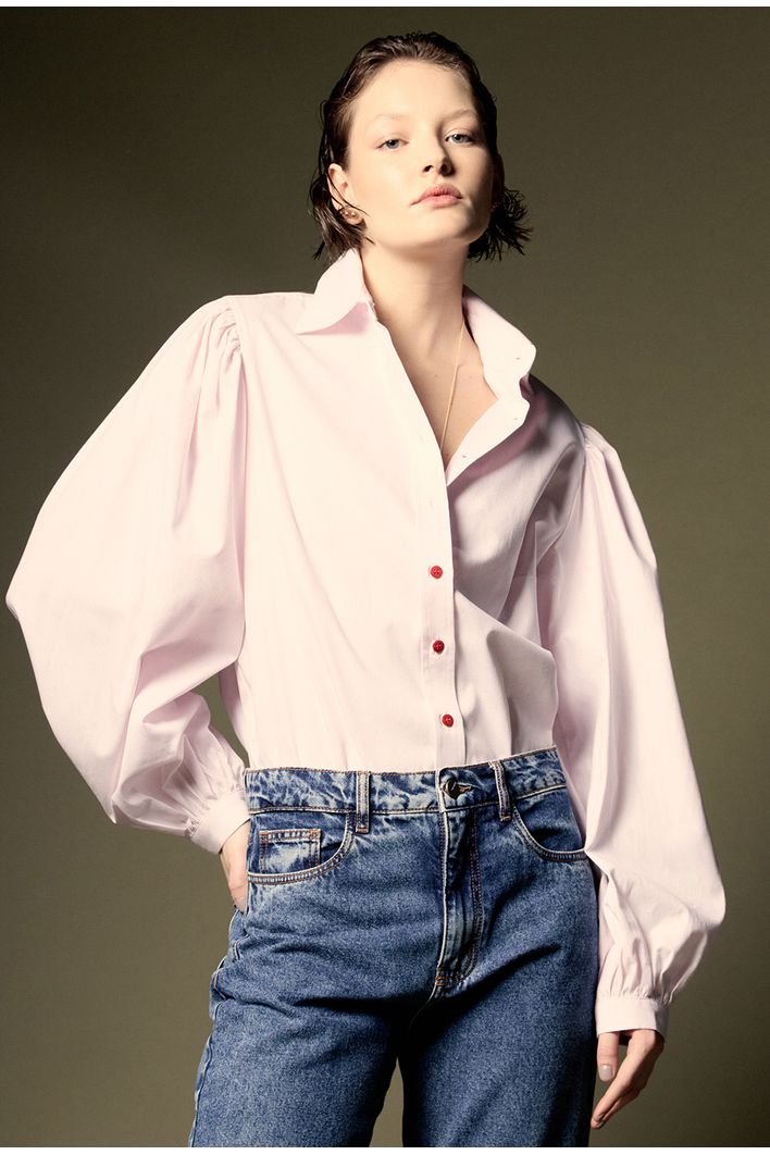 Camisa de modelagem ampla e sofisticada, com mangas bufantes e punhos estruturados que adicionam volume e elegância ao visual. Possui gola alta e botões frontais que permitem diferentes formas de uso, desde um estilo mais clássico até um toque moderno e despojado. Ideal para composições refinadas, é uma peça versátil que transita com facilidade entre o trabalho e ocasiões sociais.