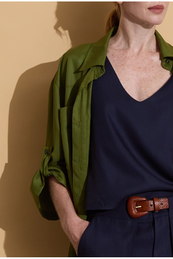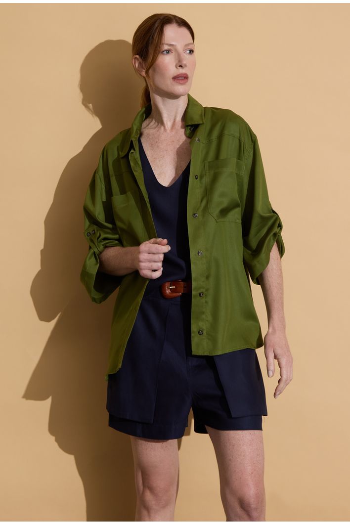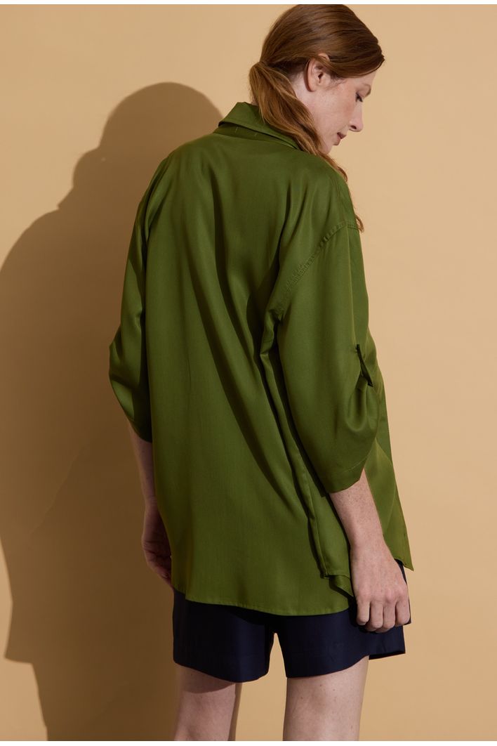 Confeccionada em 100% Lyocell, uma fibra sustentável, macia e respirável que oferece conforto excepcional e ótimo caimento. Com modelagem moderna e oversized, esta peça traz um toque de despojamento e estilo. Os dois bolsos frontais adicionam funcionalidade, enquanto os botões centrais discretos e os botões nas mangas permitem ajustes personalizados. O comprimento assimétrico entre frente e costas confere ainda mais liberdade e movimento, tornando a camisa ideal para composições versáteis.