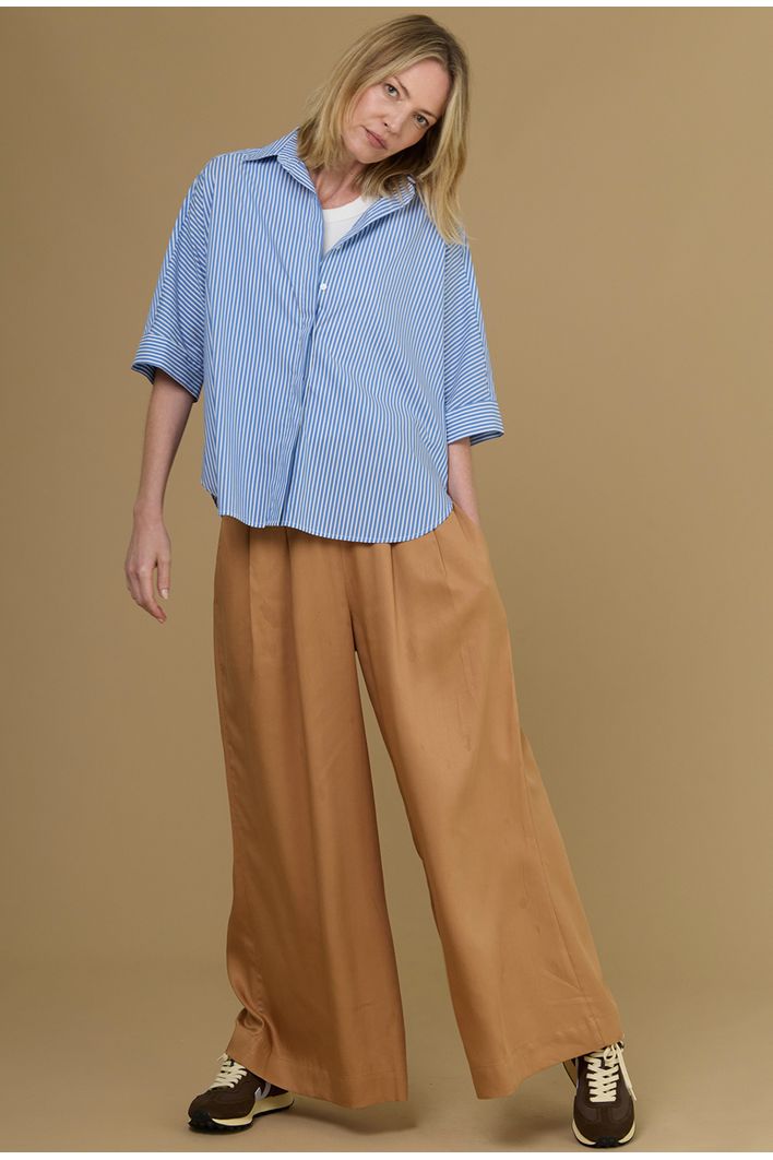 A camisa Diomedes é a união perfeita entre sofisticação, conforto e design atemporal. Confeccionada em algodão egípcio, considerado um dos mais nobres do mundo, sua composição é feita de fibras longas e finas, garantindo um toque excepcionalmente macio, alta durabilidade e um caimento impecável. Além disso, o tecido permite melhor respirabilidade, proporcionando frescor e conforto ao longo do dia. Com modelagem oversized, a peça traz um ar moderno e despojado, ideal para composições versáteis e elegantes. As listras verticais, além de serem um clássico atemporal, criam um efeito visual que alonga a silhueta, valorizando qualquer tipo de corpo.