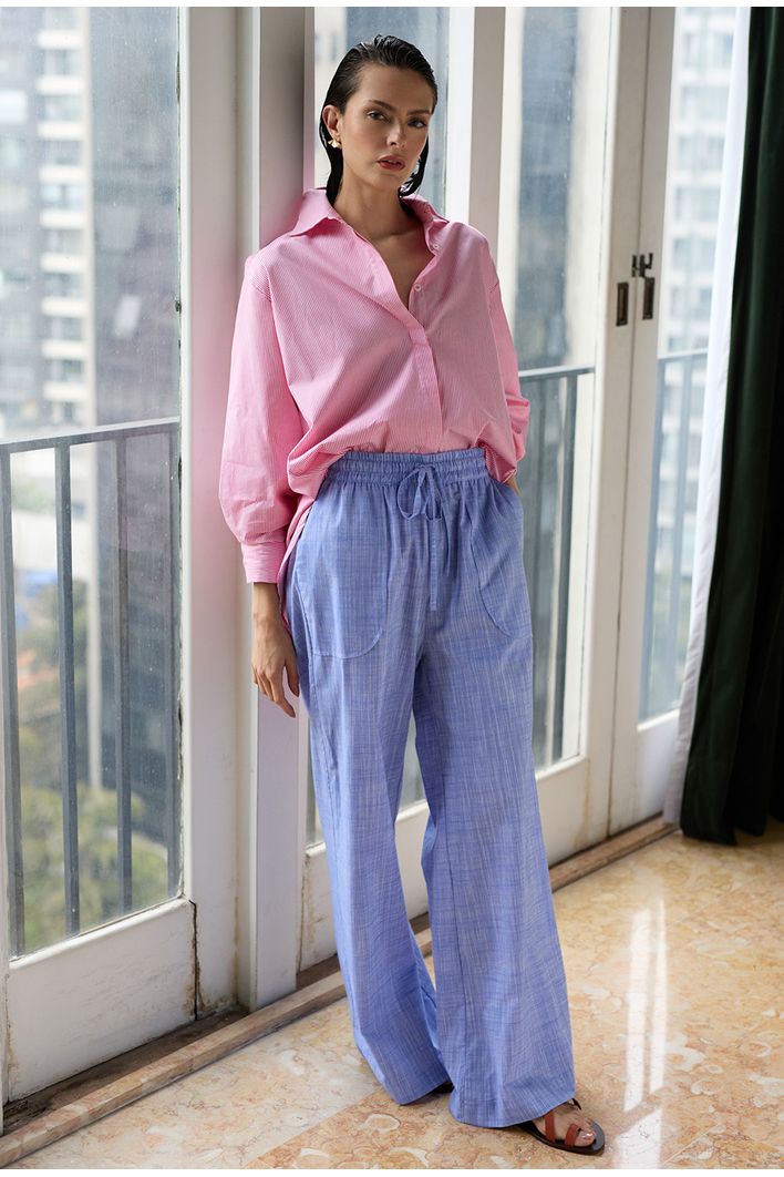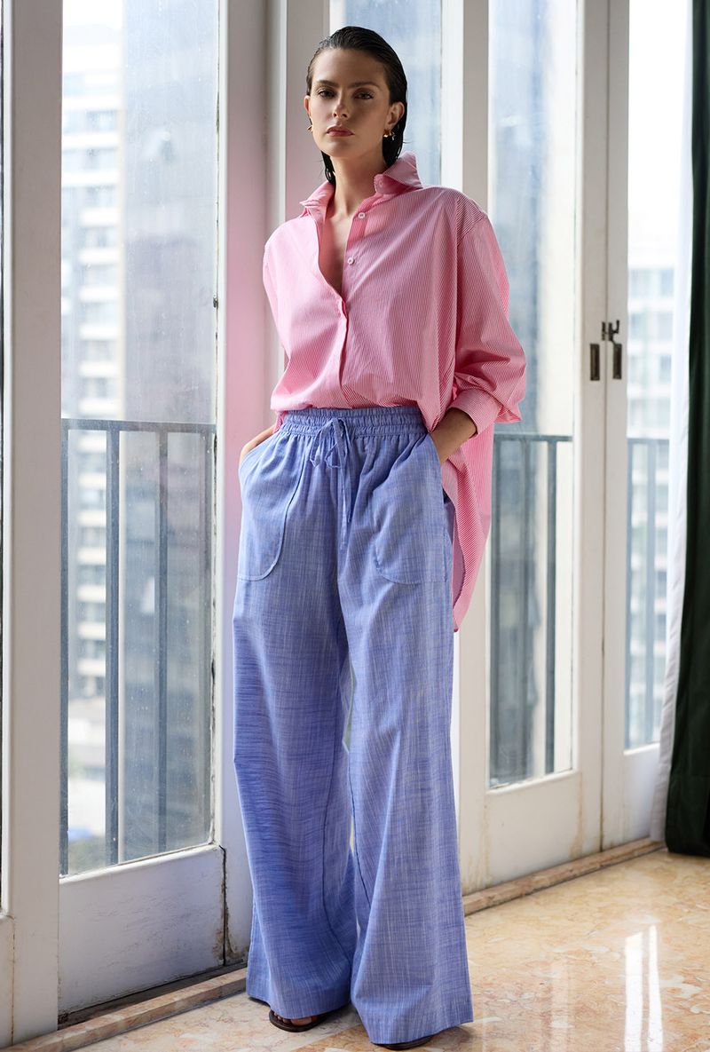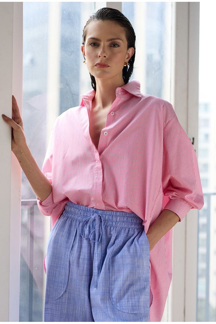 Camisa feminina com estampa clássica de listras e modelagem ampla que une conforto e estilo. Possui gola tradicional, punhos largos com botões e fechamento frontal que reforça o visual elegante e atemporal. Uma peça versátil, ideal para composições sofisticadas ou para trazer um toque refinado a produções casuais.