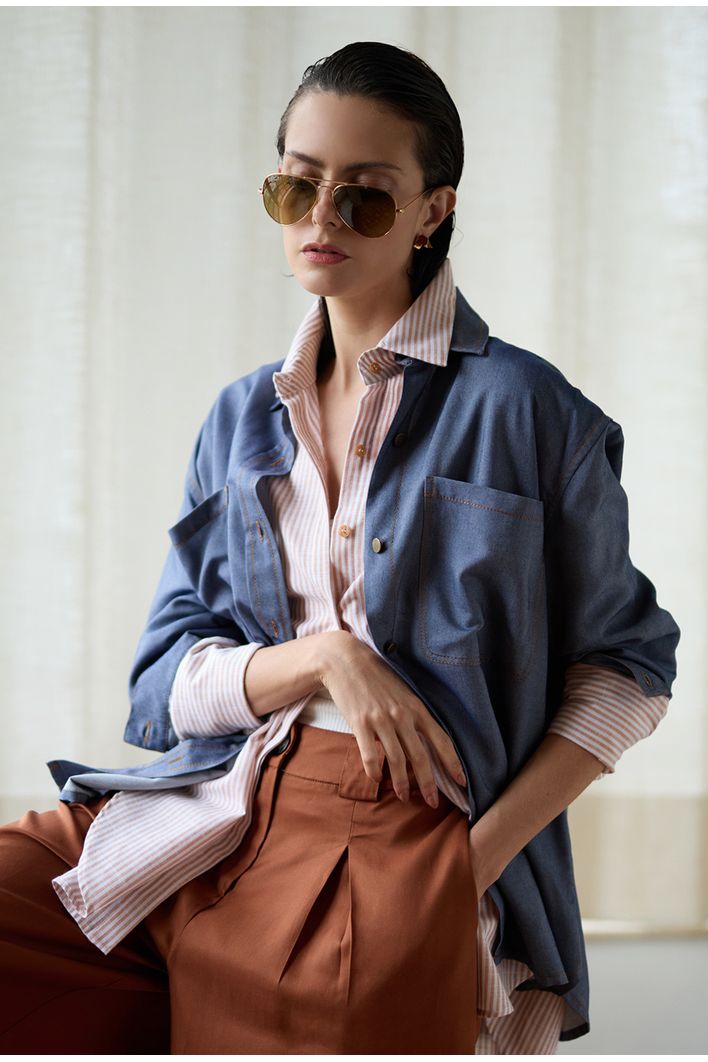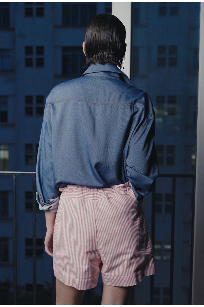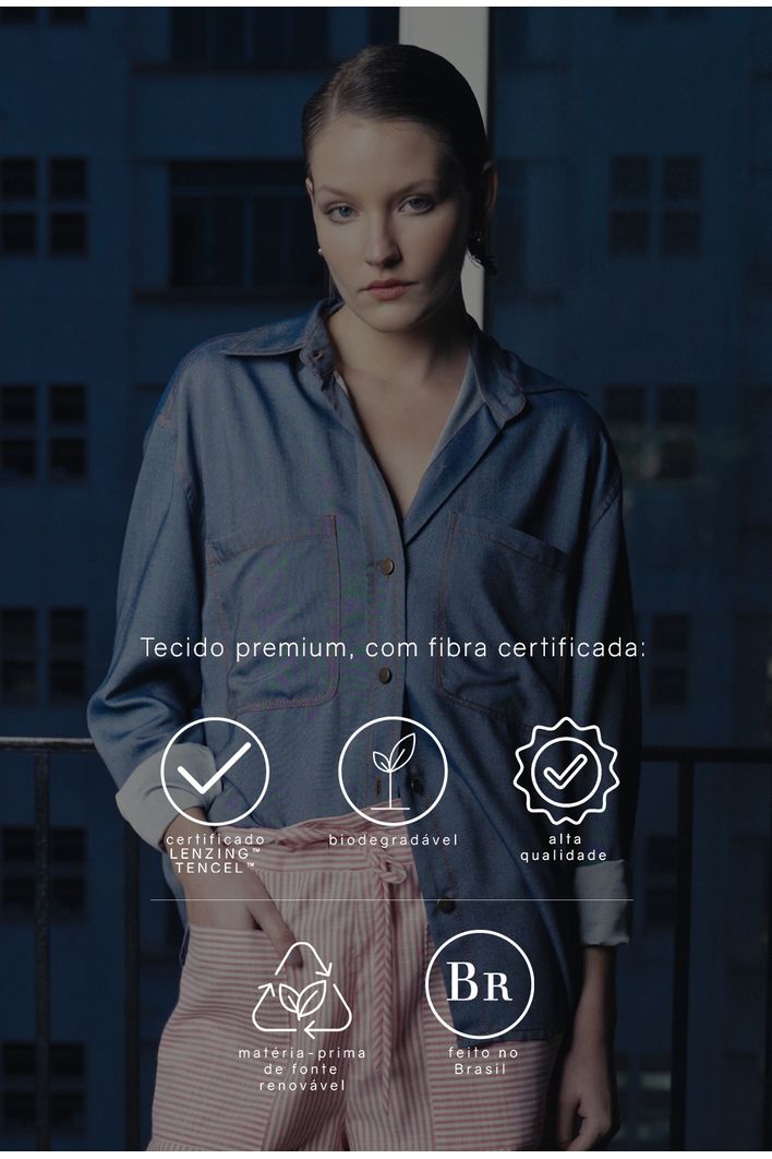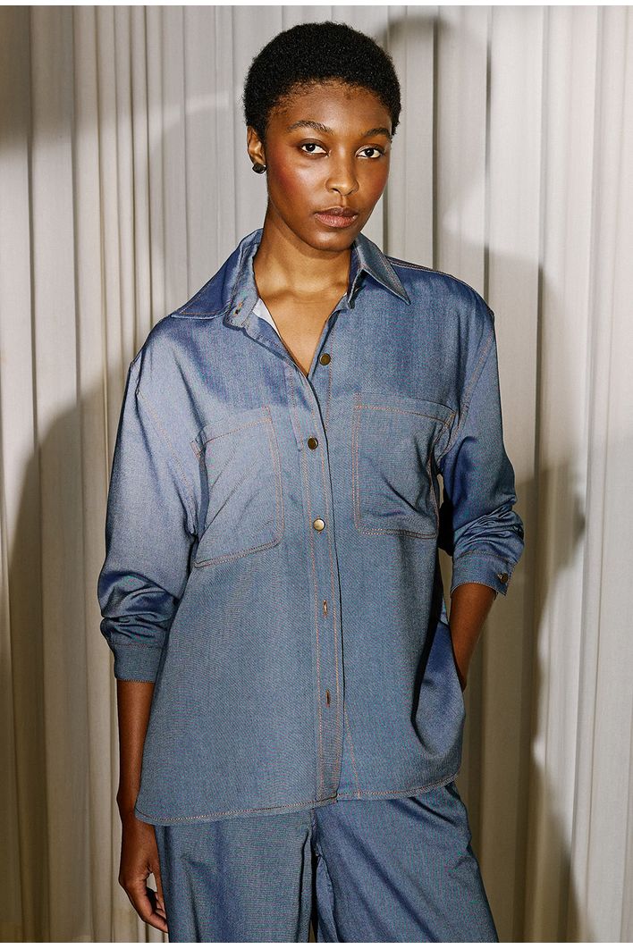 Camisa em tom jeans leve com modelagem clássica e caimento descontraído. Possui gola estruturada, bolsos frontais funcionais, fechamento por botões metálicos e costura contrastante que valoriza o design. Versátil e atemporal, é perfeita para compor produções casuais modernas, podendo ser usada tanto sozinha quanto como sobreposição.