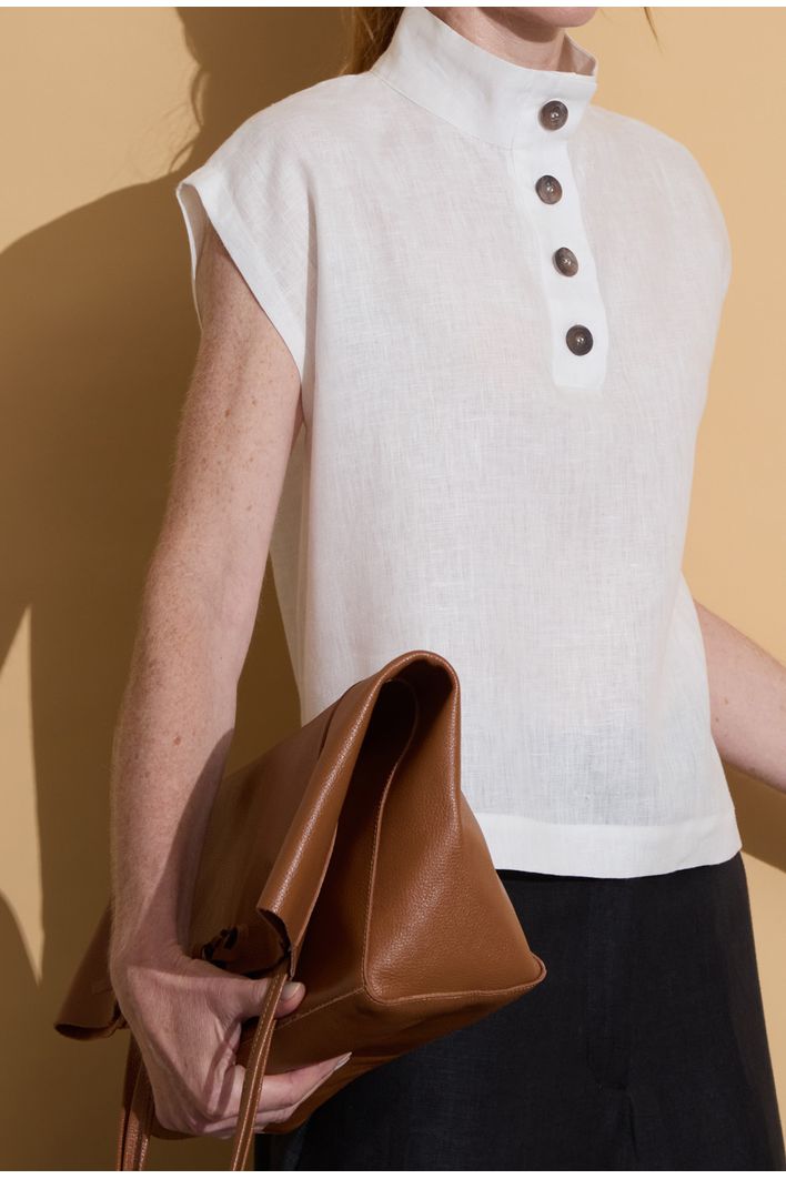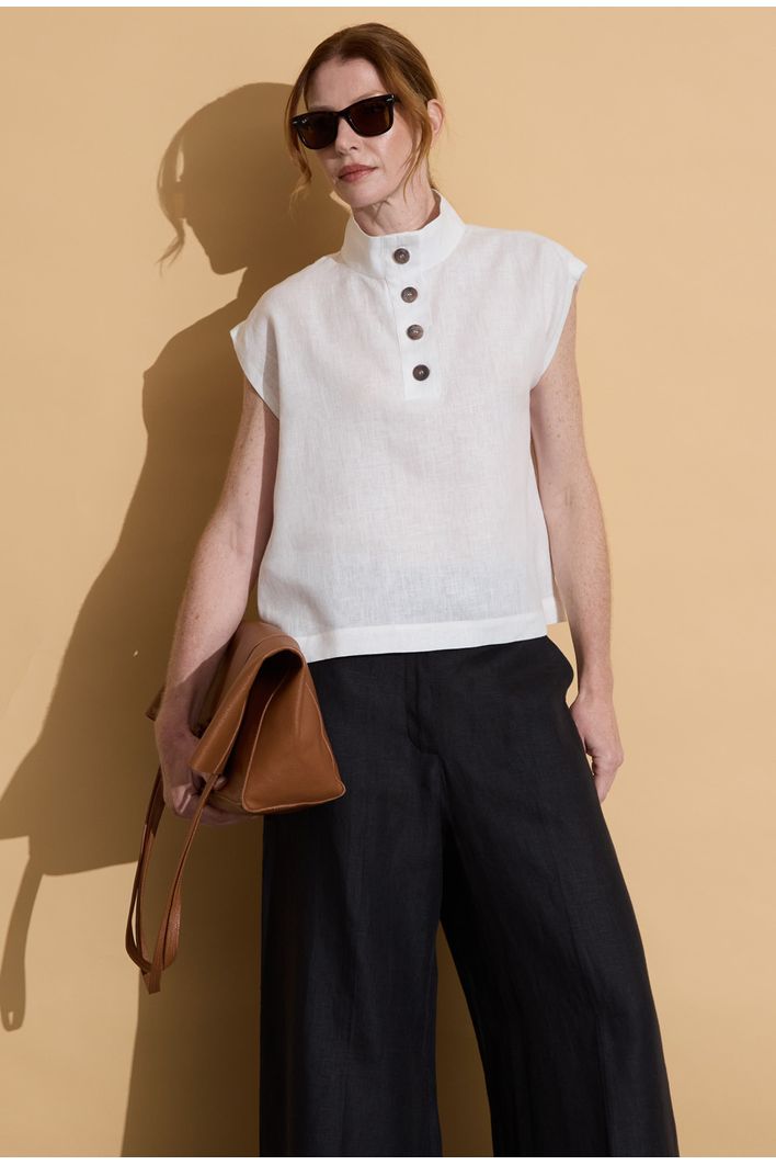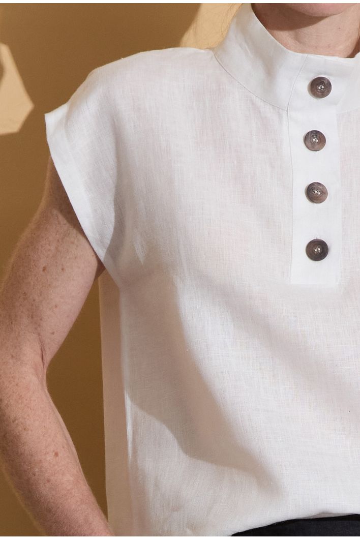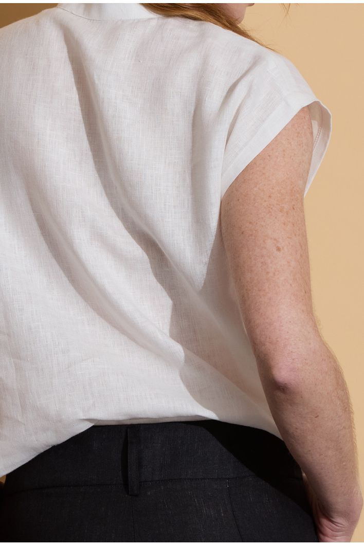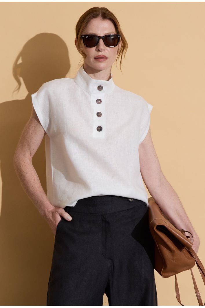 Nossa camisa tersane é um basic moderninho ao mesmo tempo que atemporal, sendo super versátil e confortável, perfeita para quem ama unir praticidade e elegância na hora de se produzir. Possui modelagem quadradinha e gola padre com botões de madeira. Sua manga é bem curtinha, dando efeito armado nos ombros.