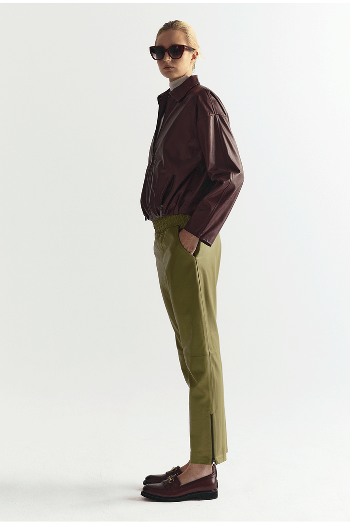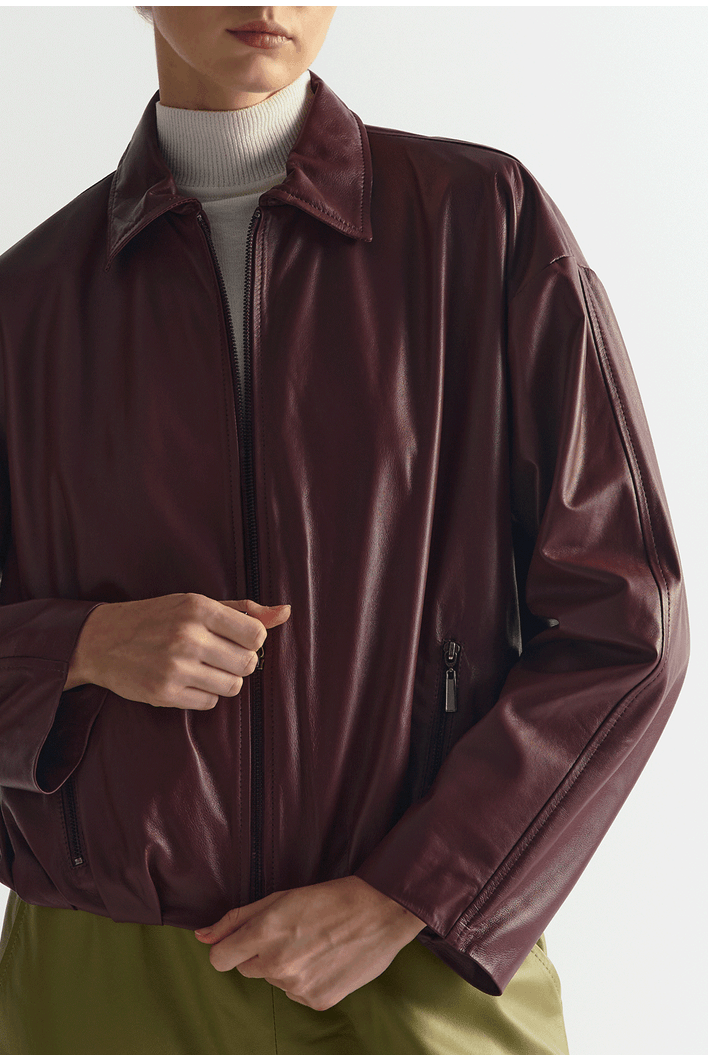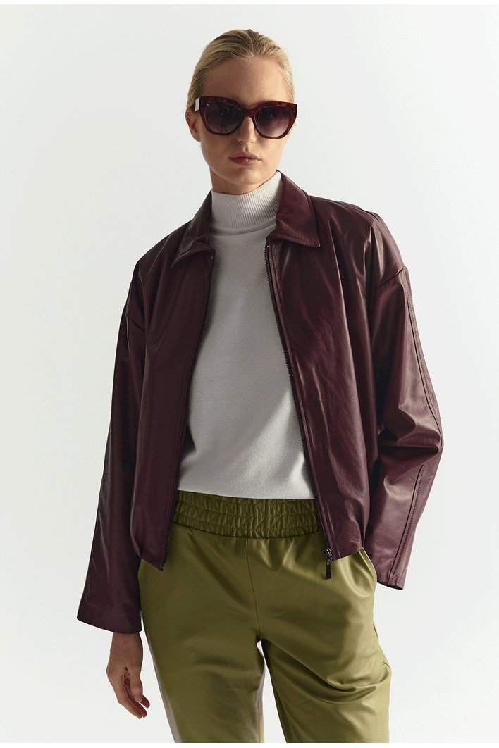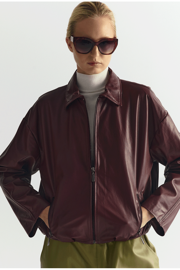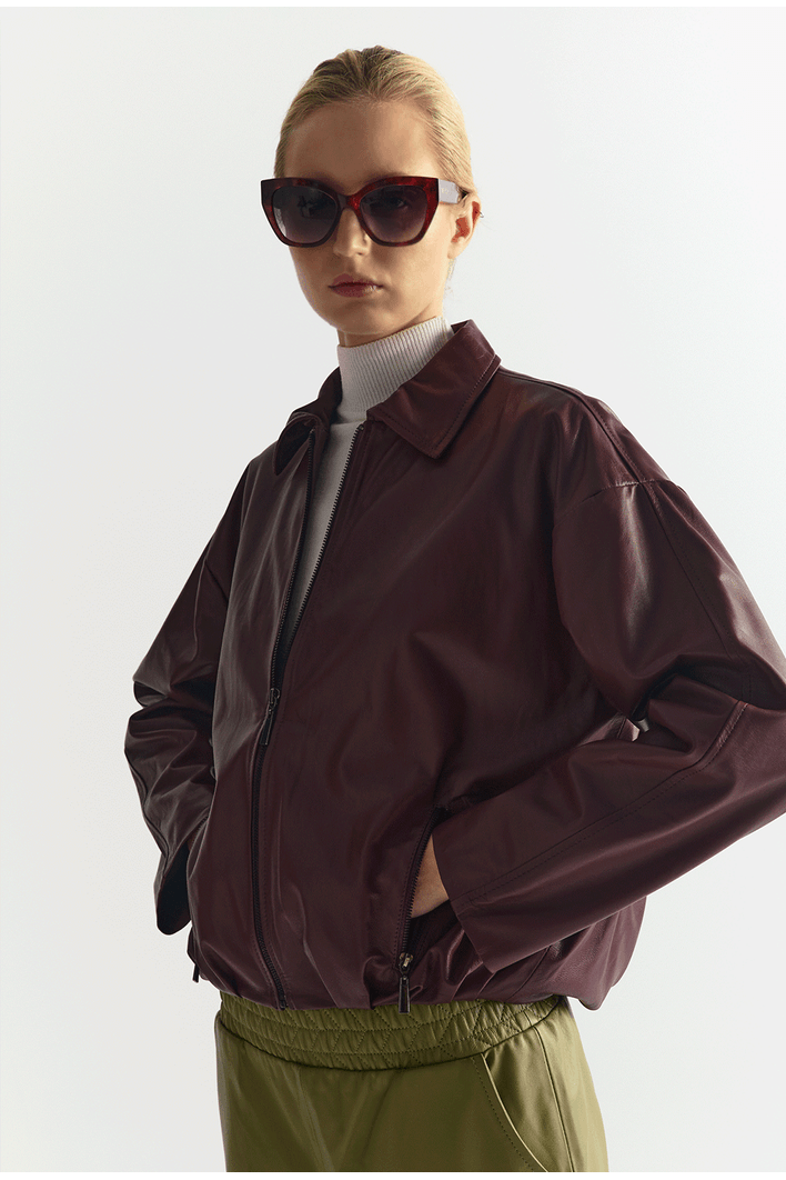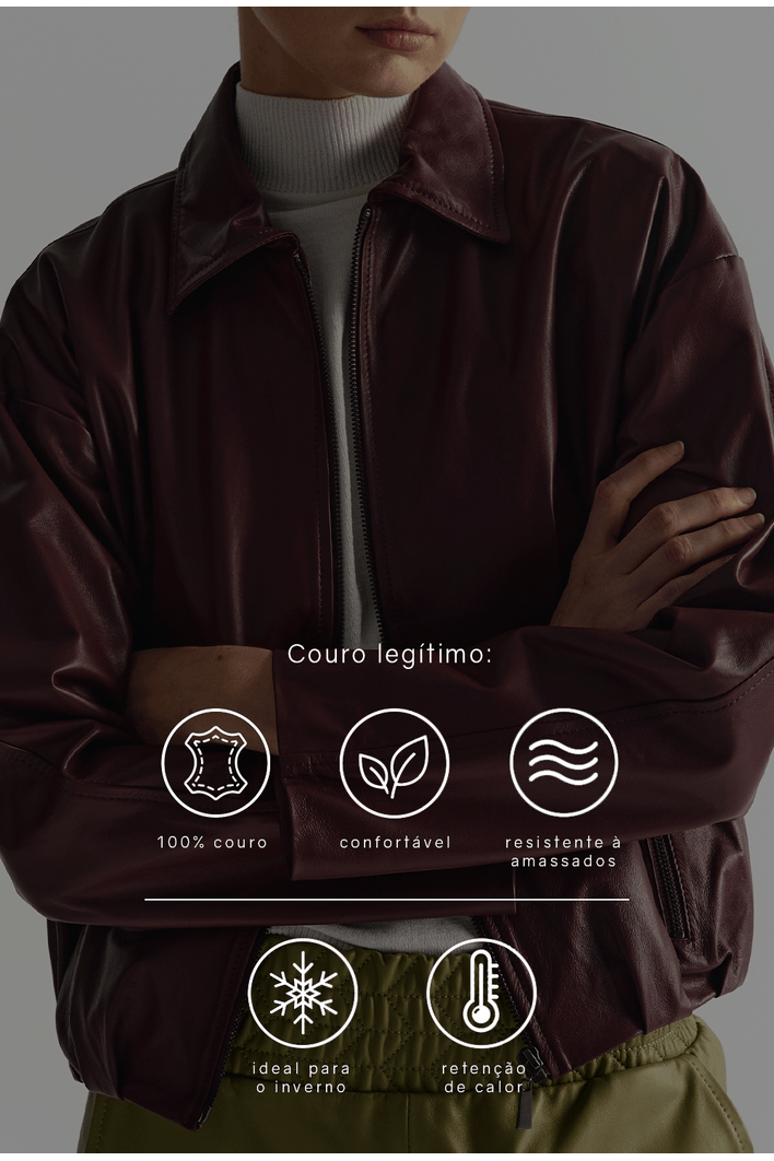 A jaqueta feminina em couro é uma peça essencial para composições modernas e elegantes. Com design minimalista e modelagem levemente ampla, proporciona um caimento confortável sem perder a sofisticação.