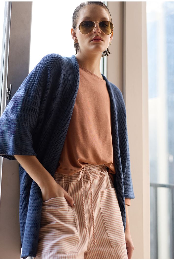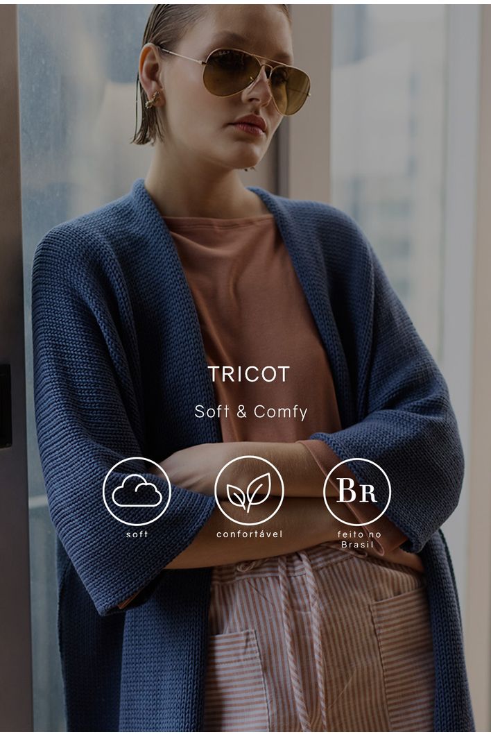 O Kimono de Tricot açores é um ótimo aliado para trazer um diferencial para um look mais básico, sua modelagem oversized é super moderna e veste bem em diversos tipos de corpos.
