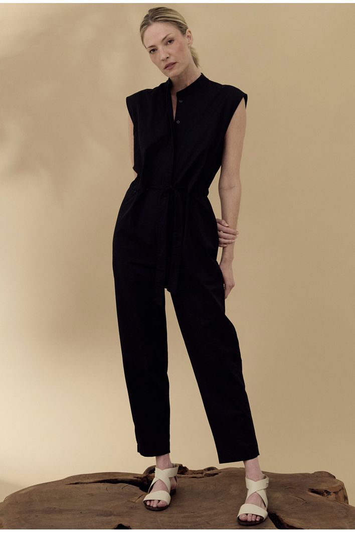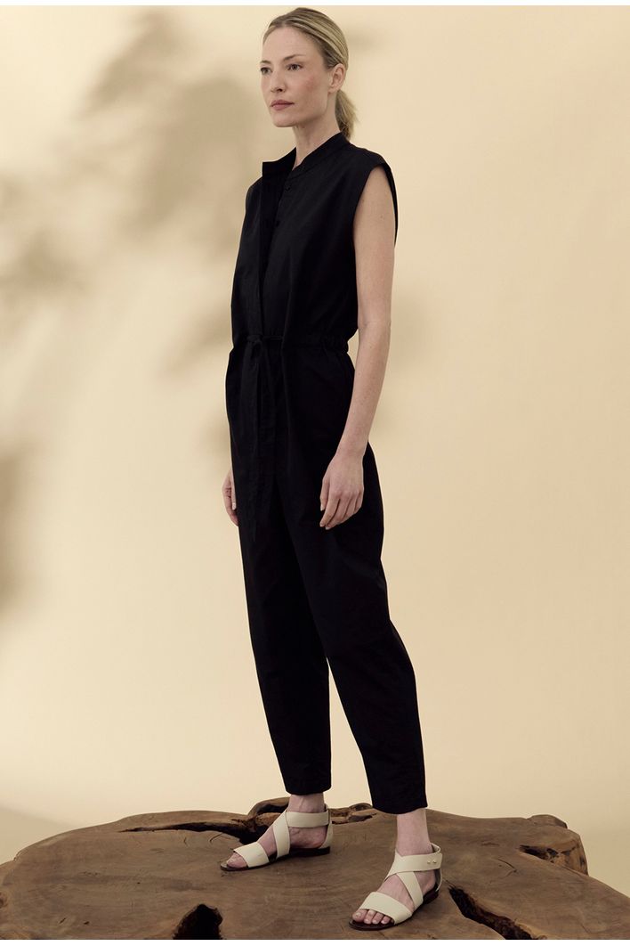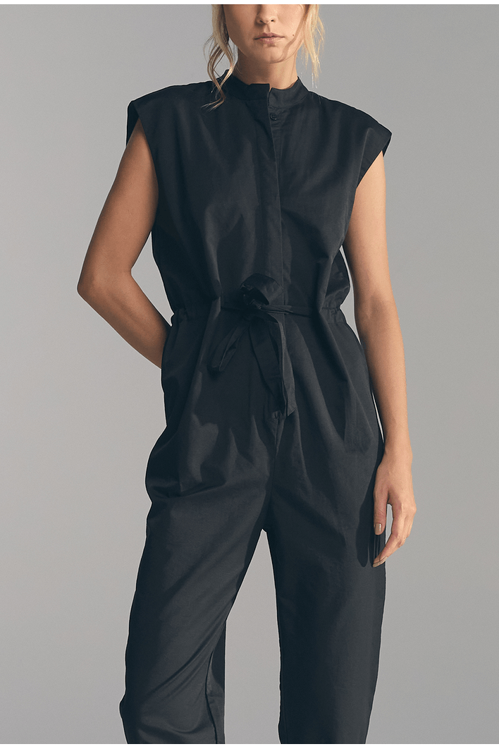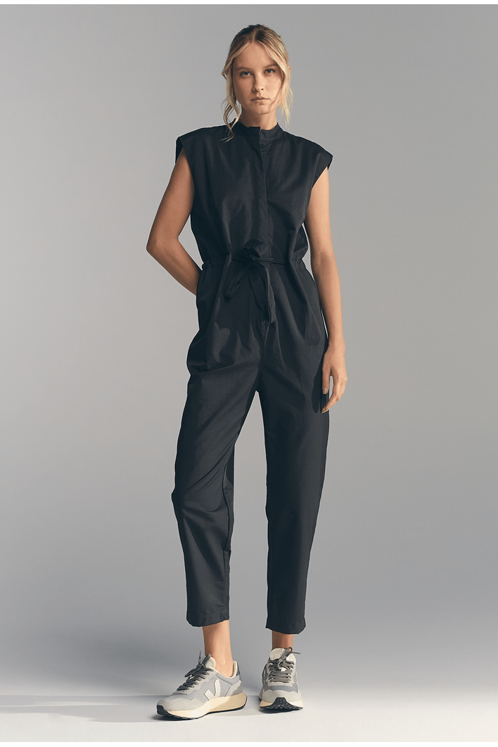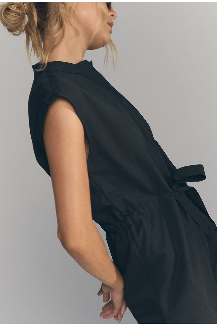 Sua modelagem é marcada por detalhes elegantes e atemporais: gola padre, calça de modelagem cenoura, que confere um caimento estruturado e sofisticado, enquanto o rolote ajustável na cintura permite um ajuste perfeito ao corpo. Modelo sem mangas.