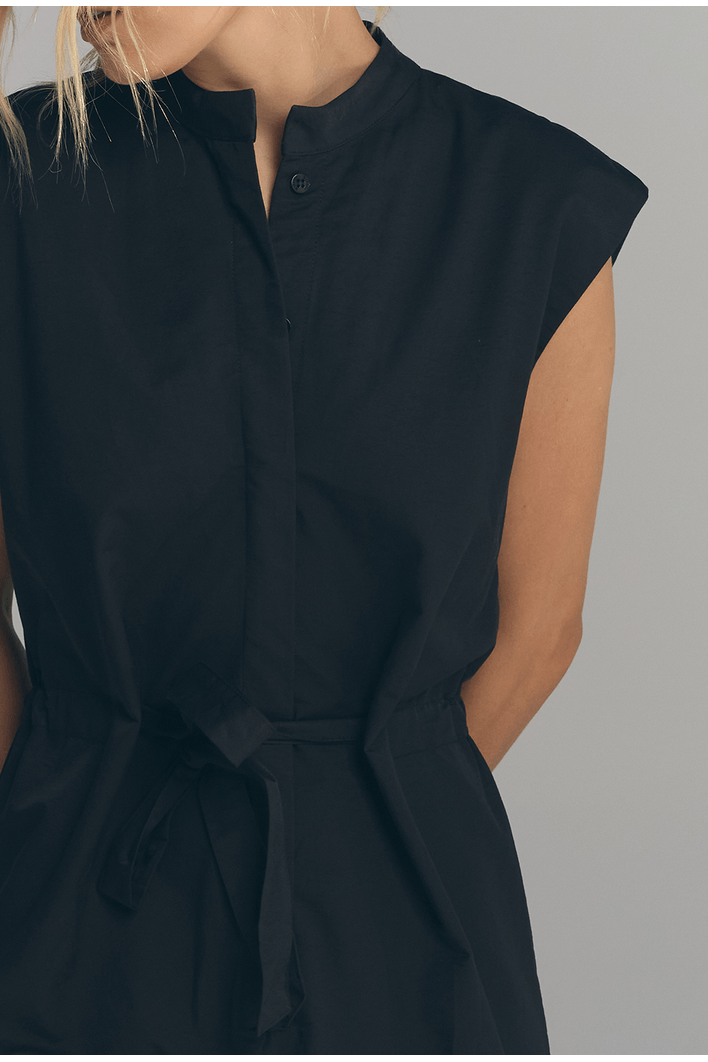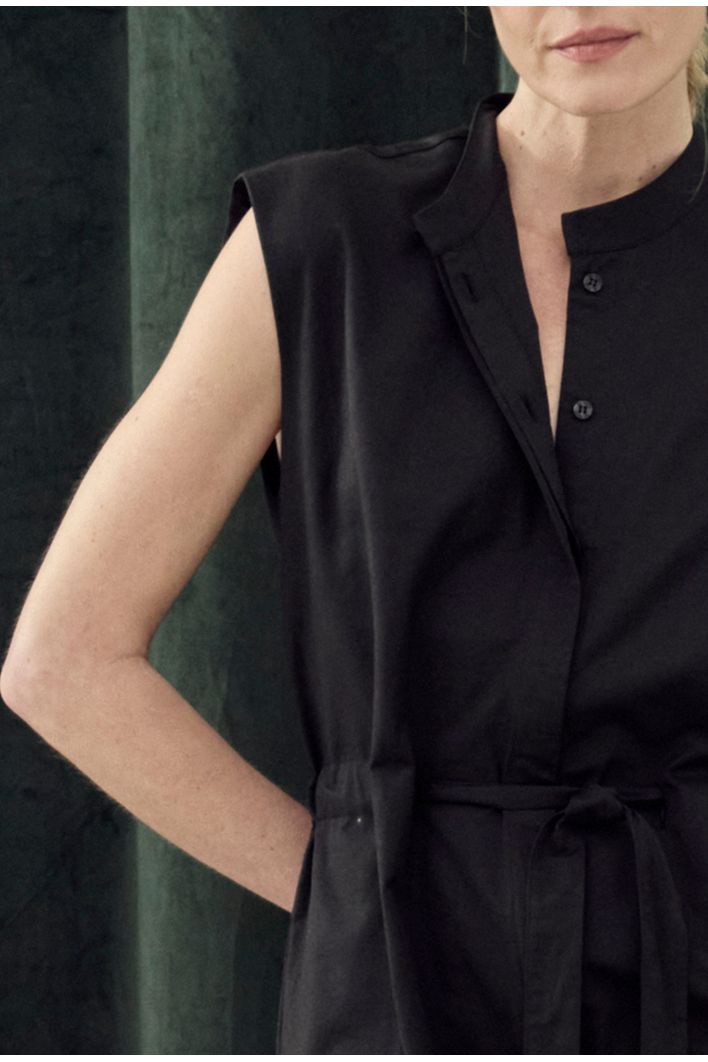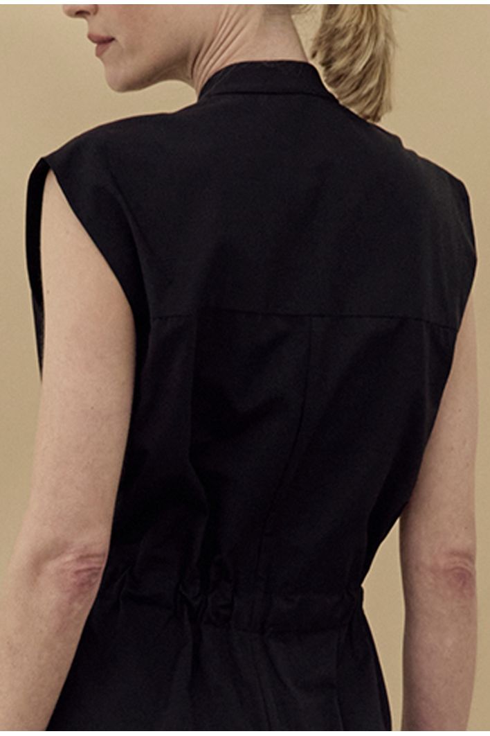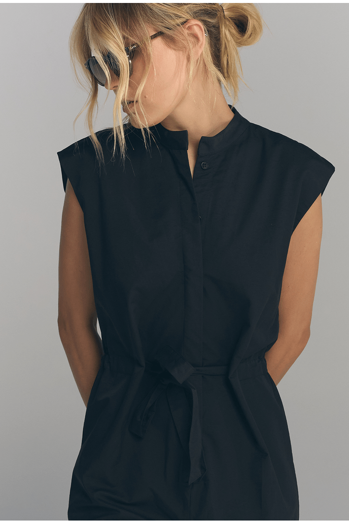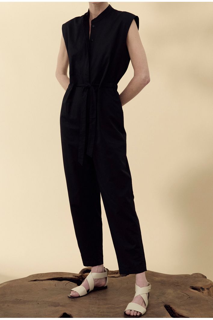 Sua modelagem é marcada por detalhes elegantes e atemporais: gola padre, calça de modelagem cenoura, que confere um caimento estruturado e sofisticado, enquanto o rolote ajustável na cintura permite um ajuste perfeito ao corpo. Modelo sem mangas.
