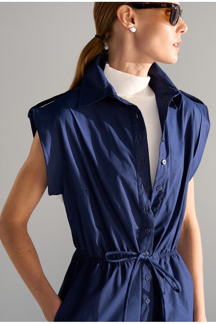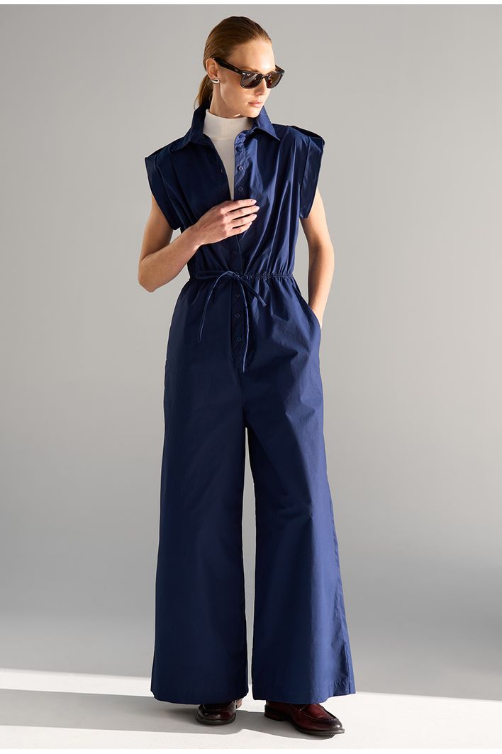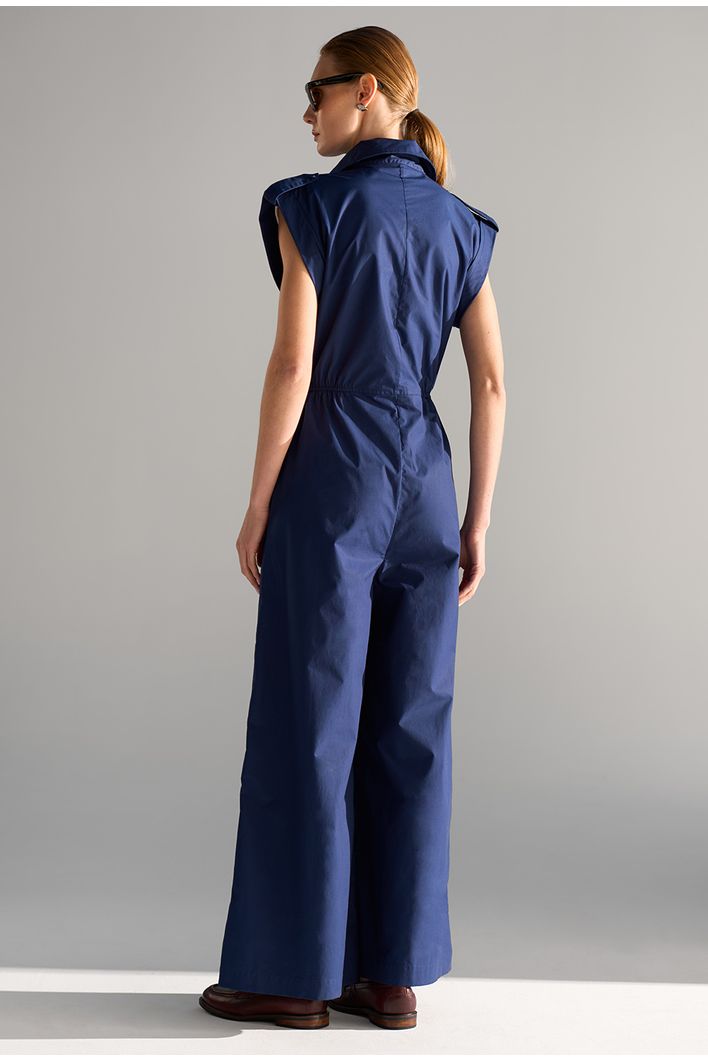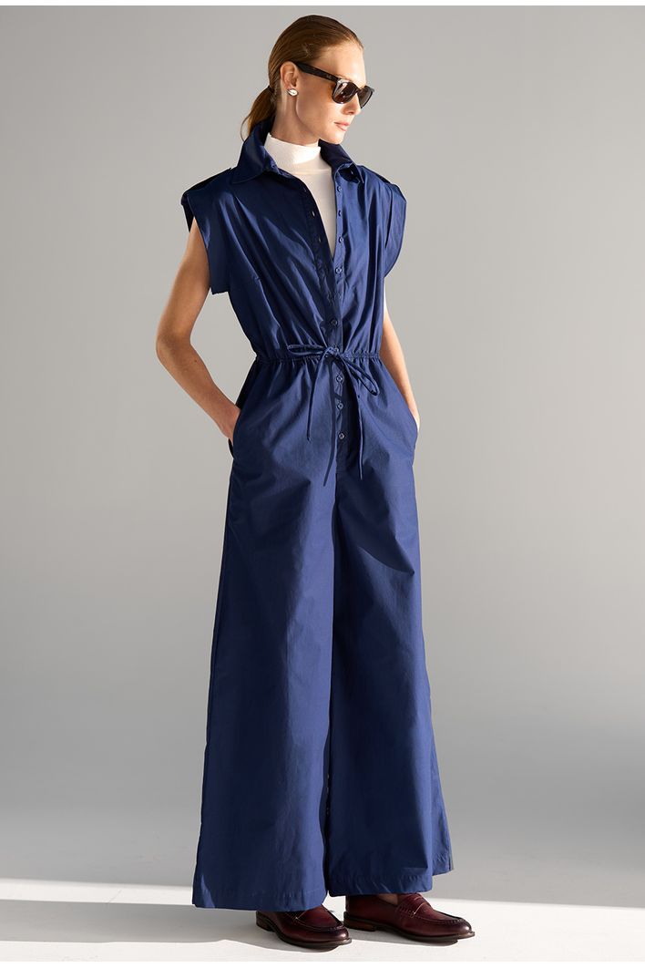 Macacão longo e sofisticado, com modelagem fluida e sem mangas. Possui decote em V, cintura marcada por faixa do mesmo tecido e calça ampla que cria efeito semelhante a saia midi. Confeccionado em tecido leve e confortável, é uma peça versátil que transita facilmente entre produções casuais e elegantes.