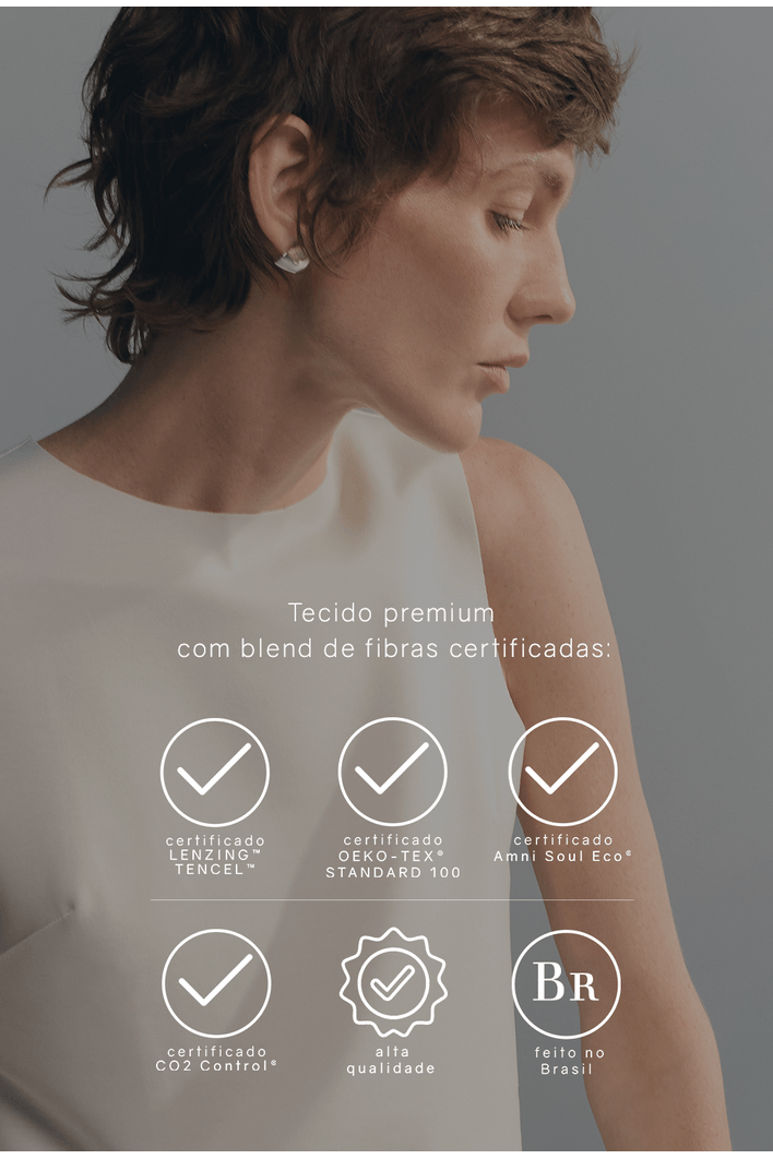 O tecido utilizado nesse modelo possui duas certificações: OEKO-TEX, Lyocell LENZING e Amni Soul Eco.