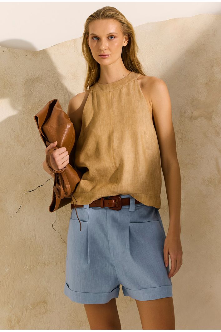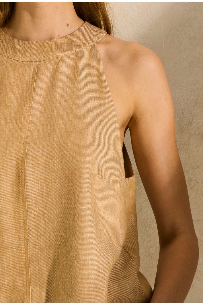 A regata Cheb é uma peça sofisticada e elegante, confeccionada em um tecido nobre que combina viscose e linho, proporcionando um toque macio, leveza e excelente respirabilidade, ideal para os dias mais quentes. Com modelagem evasê, ela oferece um caimento fluido e confortável, garantindo liberdade de movimentos e um visual moderno. O decote nadador é um destaque especial, valorizando os ombros e alongando a silhueta feminina de forma sutil e elegante.