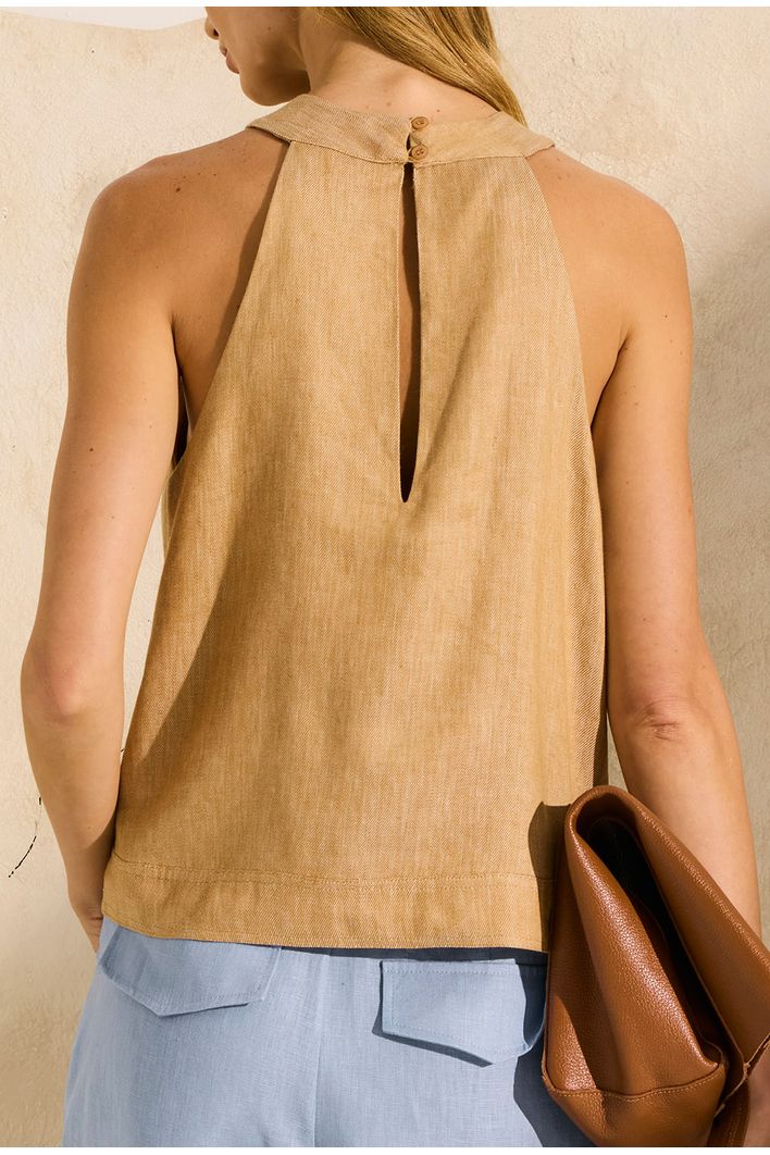 Outro ponto de atenção é a gola especial, com um formato único que adiciona sofisticação e exclusividade à peça, além de ser complementada pelo fechamento traseiro discreto, com botão no mesmo tom do tecido, garantindo um acabamento impecável. Versátil e cheia de charme, a regata Cheb é perfeita para compor looks casuais com um toque de elegância ou para ocasiões que pedem um estilo mais refinado.
