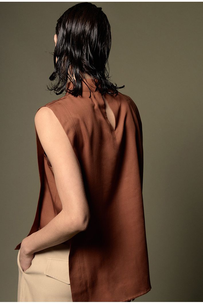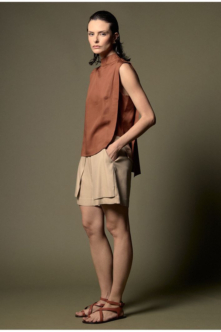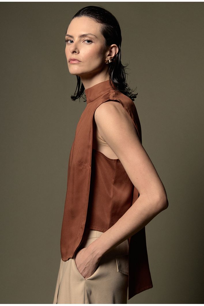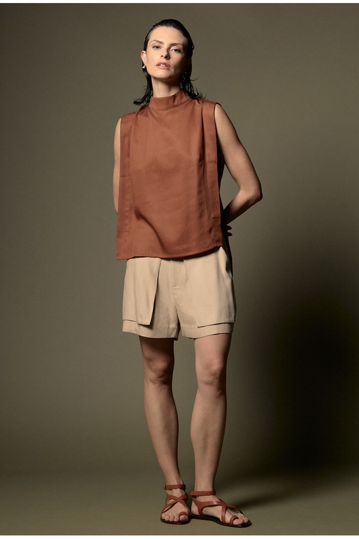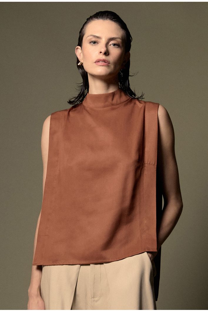 A regata apresenta um design minimalista e sofisticado, com modelagem reta e gola alta que adiciona um toque moderno ao visual. Confeccionada em tecido leve e fluido, garante caimento elegante e conforto ao vestir. Sem mangas e com acabamento impecável, é uma peça versátil que transita facilmente entre produções casuais e refinadas. Ideal para compor looks contemporâneos com alfaiataria, saias ou jeans, mantendo sempre uma estética clean e atemporal.