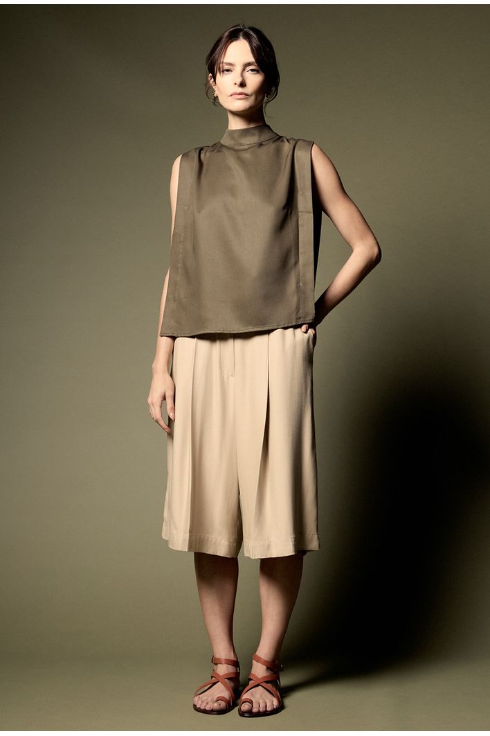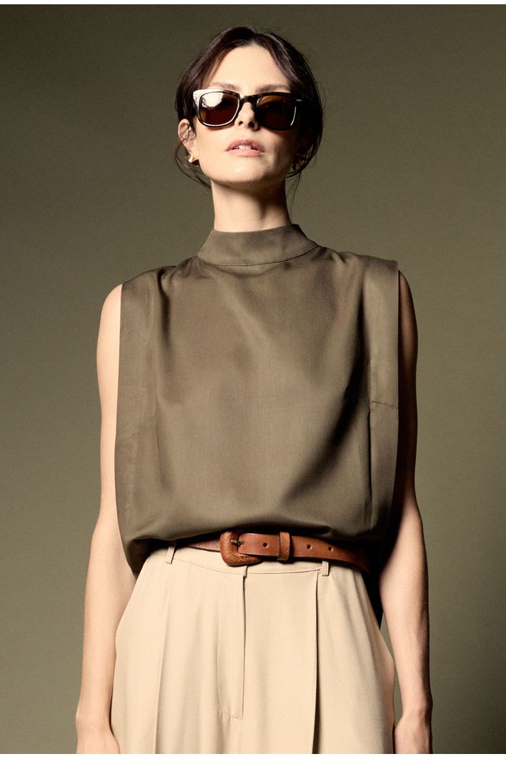 A regata apresenta um design minimalista e sofisticado, com modelagem reta e gola alta que adiciona um toque moderno ao visual. Confeccionada em tecido leve e fluido, garante caimento elegante e conforto ao vestir. Sem mangas e com acabamento impecável, é uma peça versátil que transita facilmente entre produções casuais e refinadas. Ideal para compor looks contemporâneos com alfaiataria, saias ou jeans, mantendo sempre uma estética clean e atemporal.