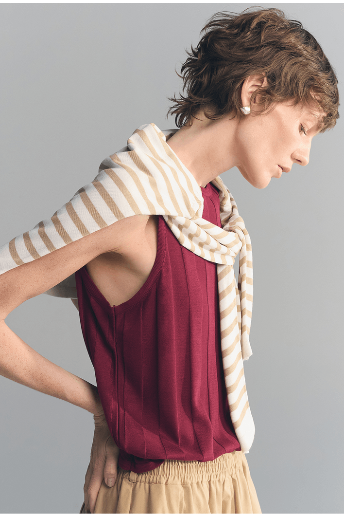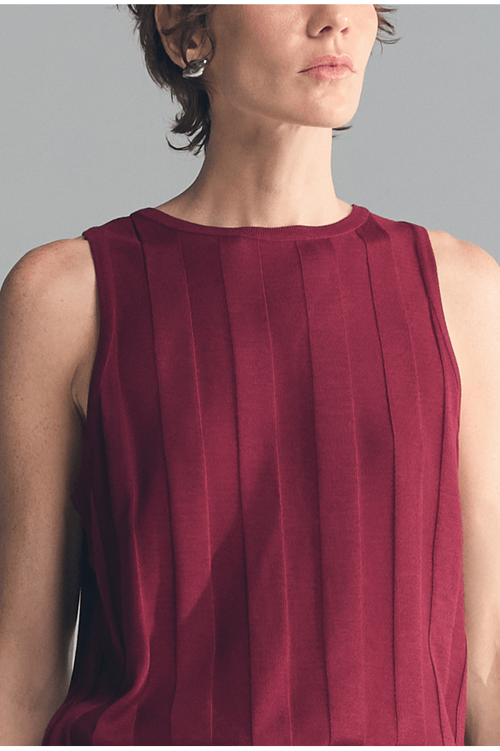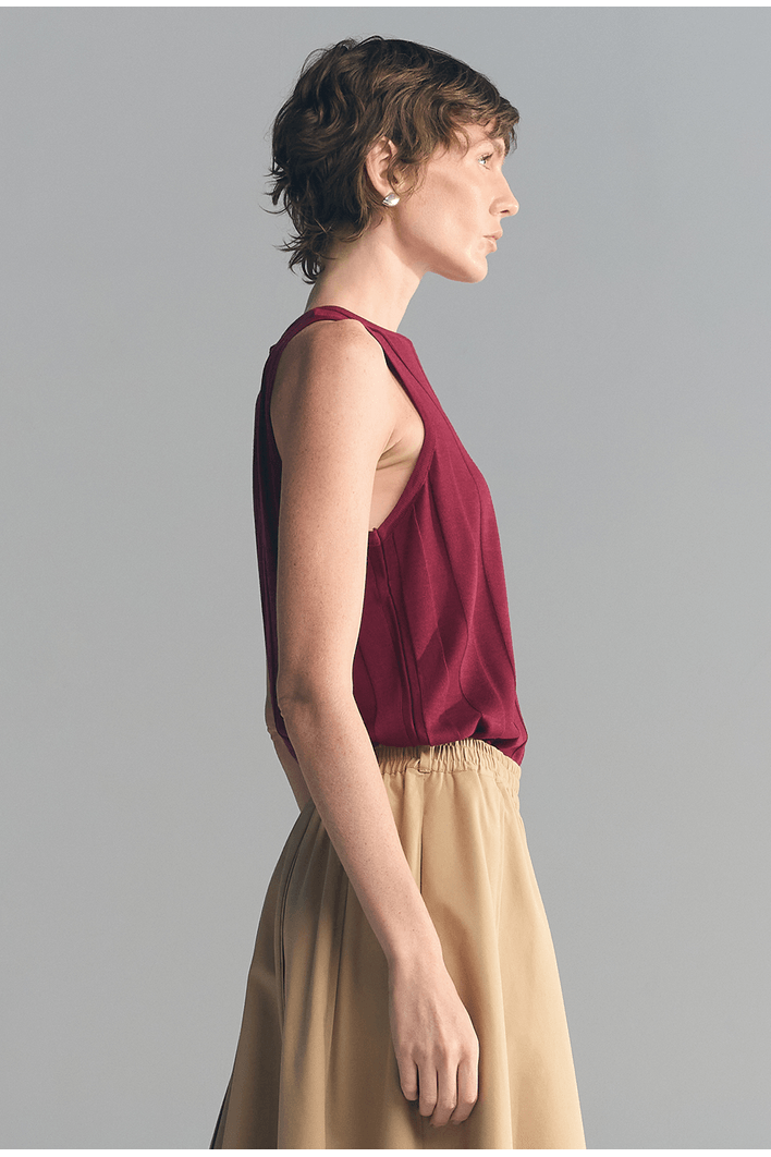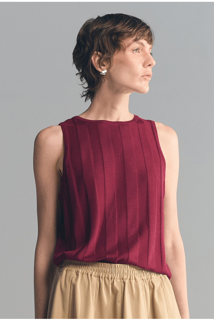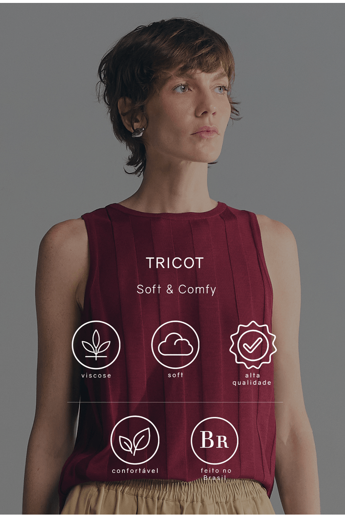 Minimalista e sofisticada, essa regata apresenta textura vertical que alonga a silhueta e valoriza o caimento da peça. Seu design sem mangas e acabamento refinado proporcionam elegância na medida certa para produções versáteis.
