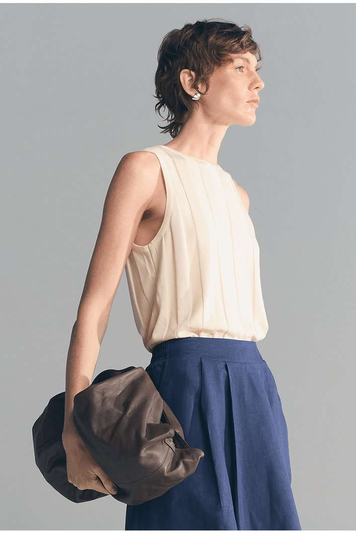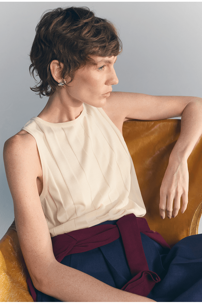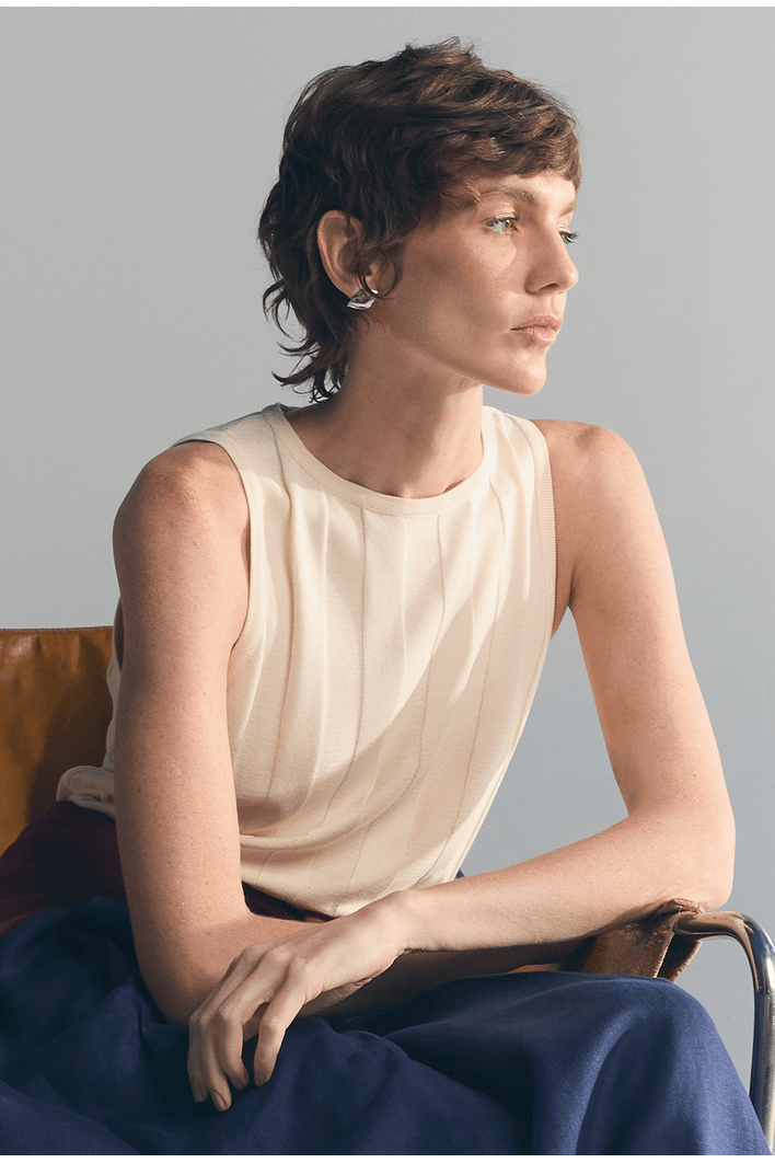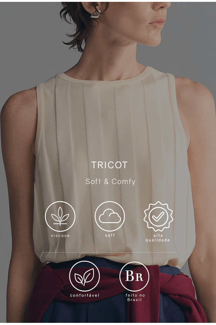 Minimalista e sofisticada, essa regata apresenta textura vertical que alonga a silhueta e valoriza o caimento da peça. Seu design sem mangas e acabamento refinado proporcionam elegância na medida certa para produções versáteis.