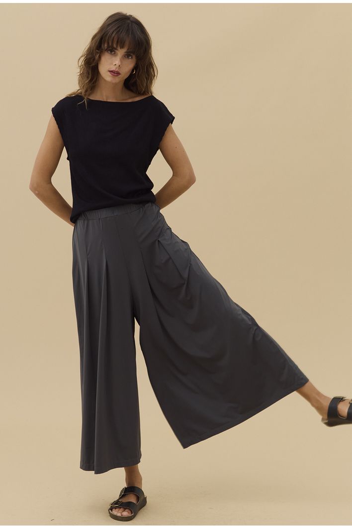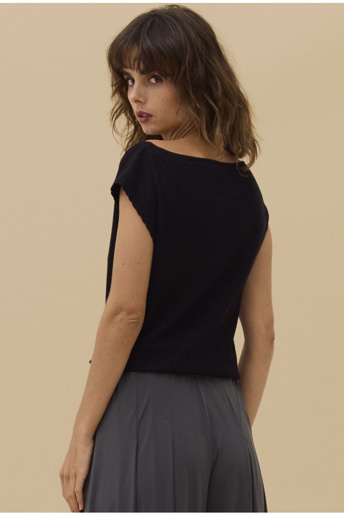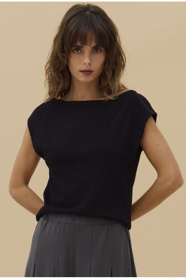 Seu diferencial está na malha canelada com aspecto aveludado, que confere uma textura delicada, elevando o visual com sofisticação. A modelagem minimalista e extremamente elegante destaca linhas limpas e um caimento impecável, tornando a peça ideal para compor produções que vão do casual chic ao sofisticado com facilidade.