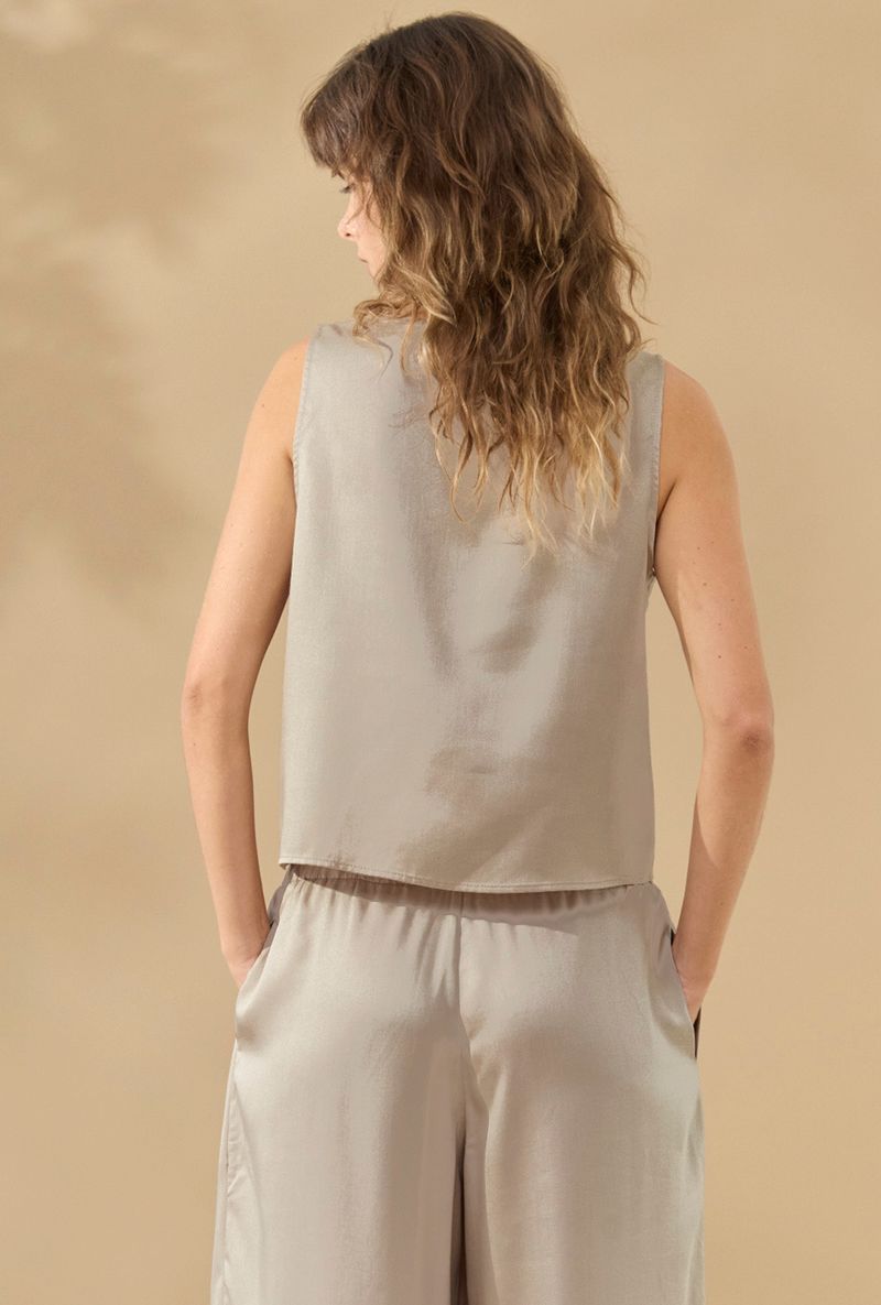 para quem deseja um visual sofisticado uma boa pedida é combinar a regata stiniva com uma de nossas calças de alfaiataria, como a navarro e a sato, sobrepondo com o blazer saiko e finalizando com saltinho ou rasteirinha nos pés. Para quem busca uma proposta mais casual uma ideia é apostar em um de nossos shorts, como o pilos e nos pés um de nossos tênis vert.