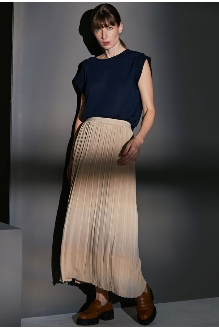 A Saia Blink, confeccionada em tricô de viscose, é uma peça que combina elegância e conforto. Seu comprimento longuete é ideal para quem busca sofisticação, proporcionando um visual alongado e versátil, adequado tanto para ambientes formais quanto informais. A superfície plissada adiciona textura e movimento à peça, garantindo um toque de modernidade e charme.
