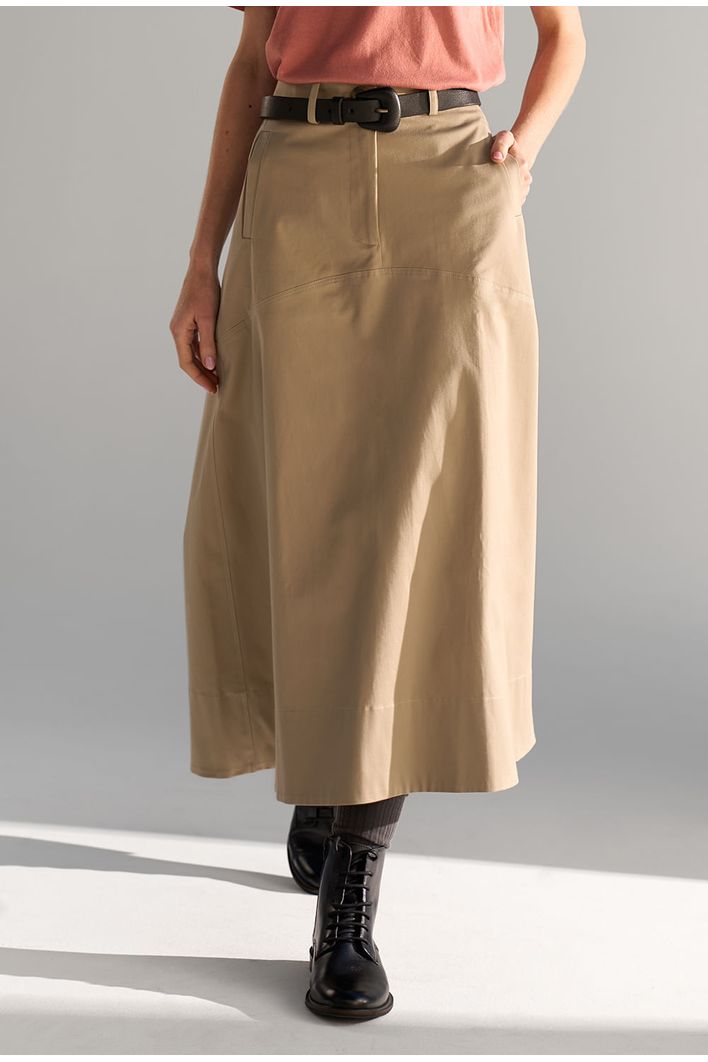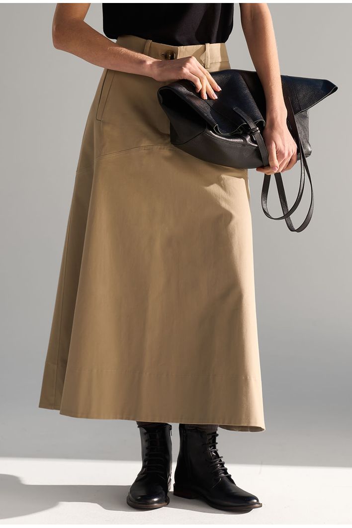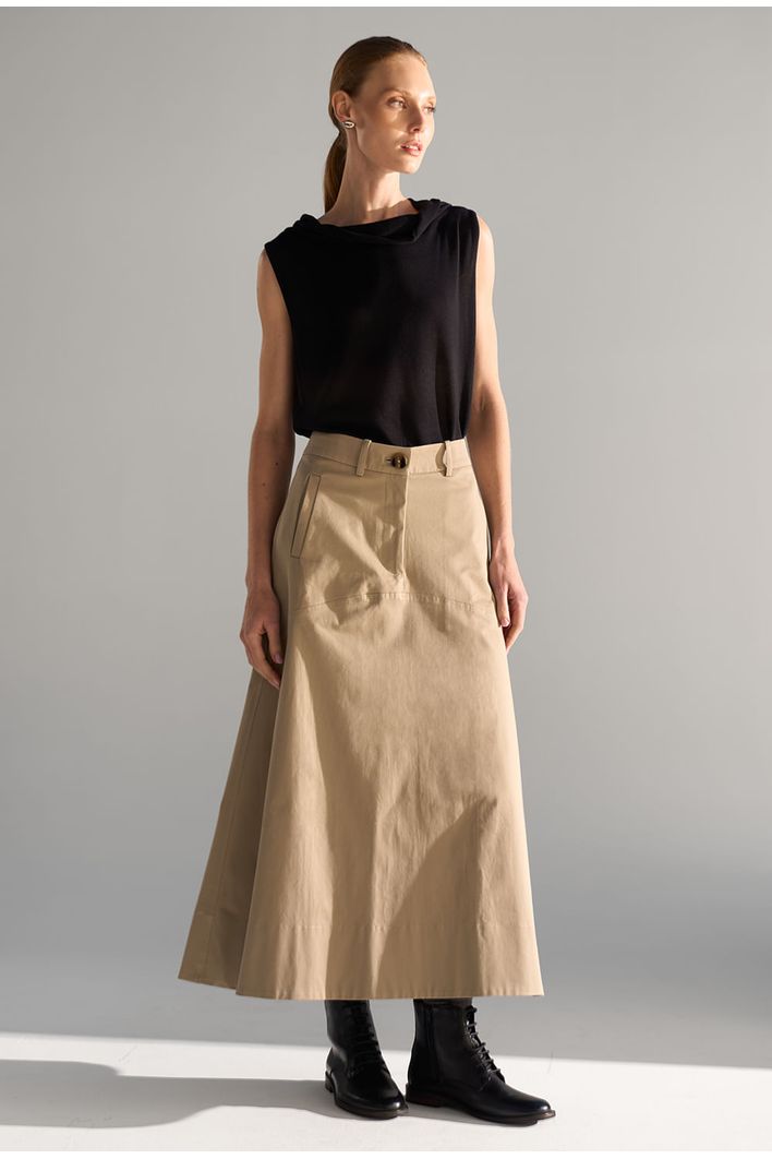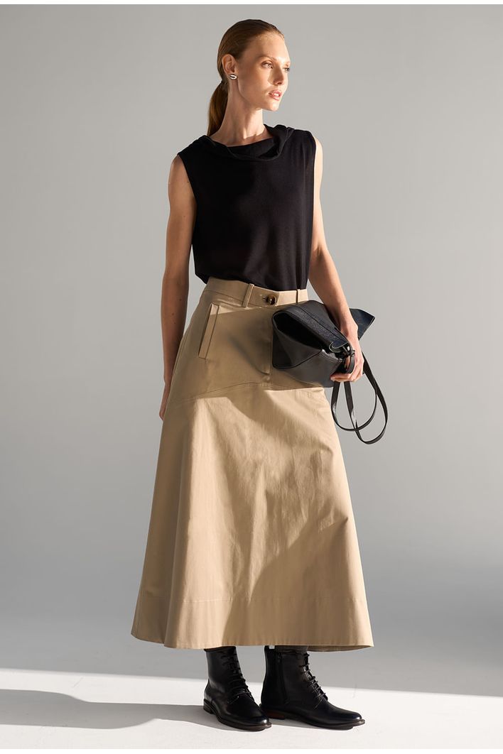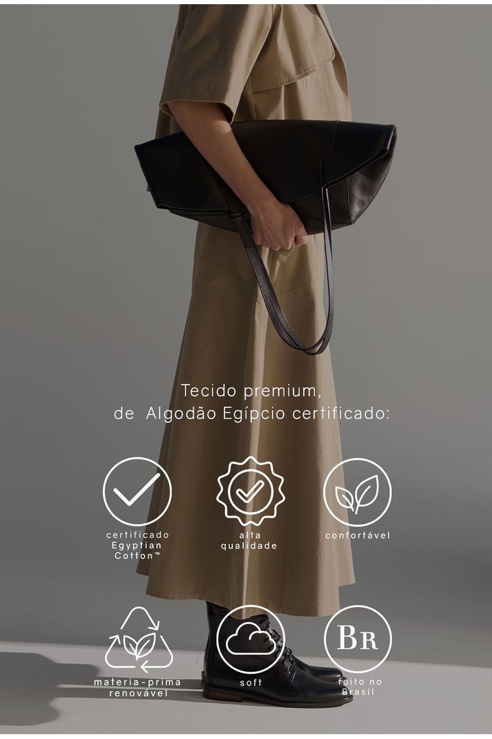 Saia Guam Midi em modelagem reta levemente evasê, confeccionada em algodão egípcio — fibra nobre reconhecida pela maciez, resistência e durabilidade — que garante toque suave e caimento estruturado. Possui recorte horizontal na altura do quadril, bolsos frontais funcionais e fechamento por zíper invisível. Versátil e atemporal, é perfeita para compor produções casuais ou sofisticadas, podendo ser combinada com camisas, tricôs ou camisetas para diferentes ocasiões.