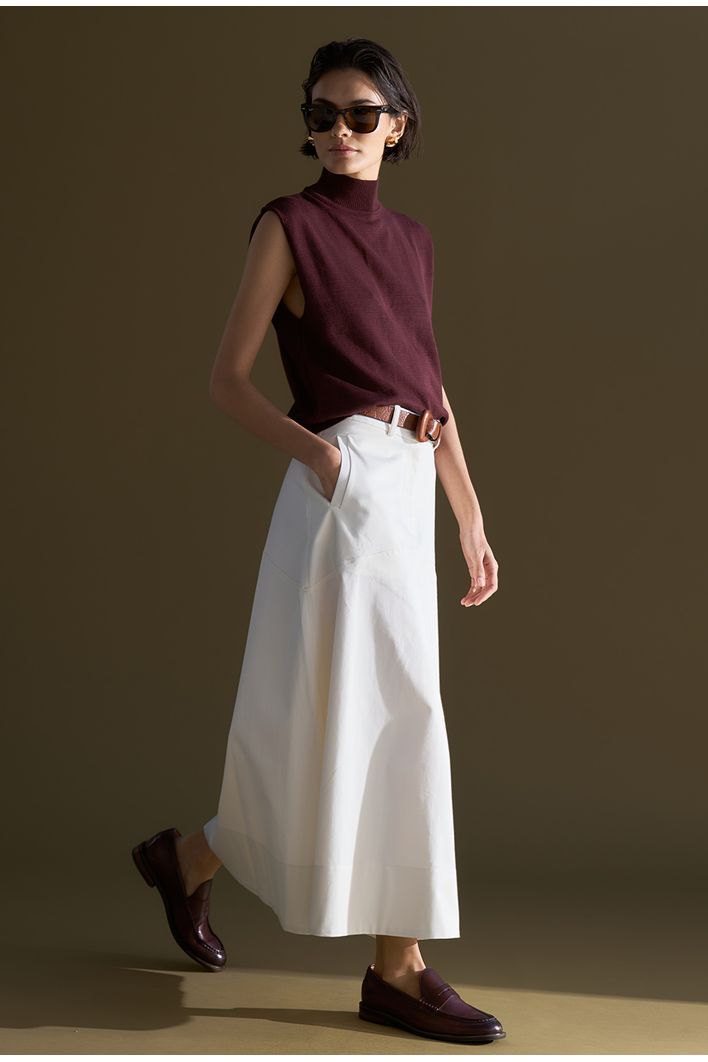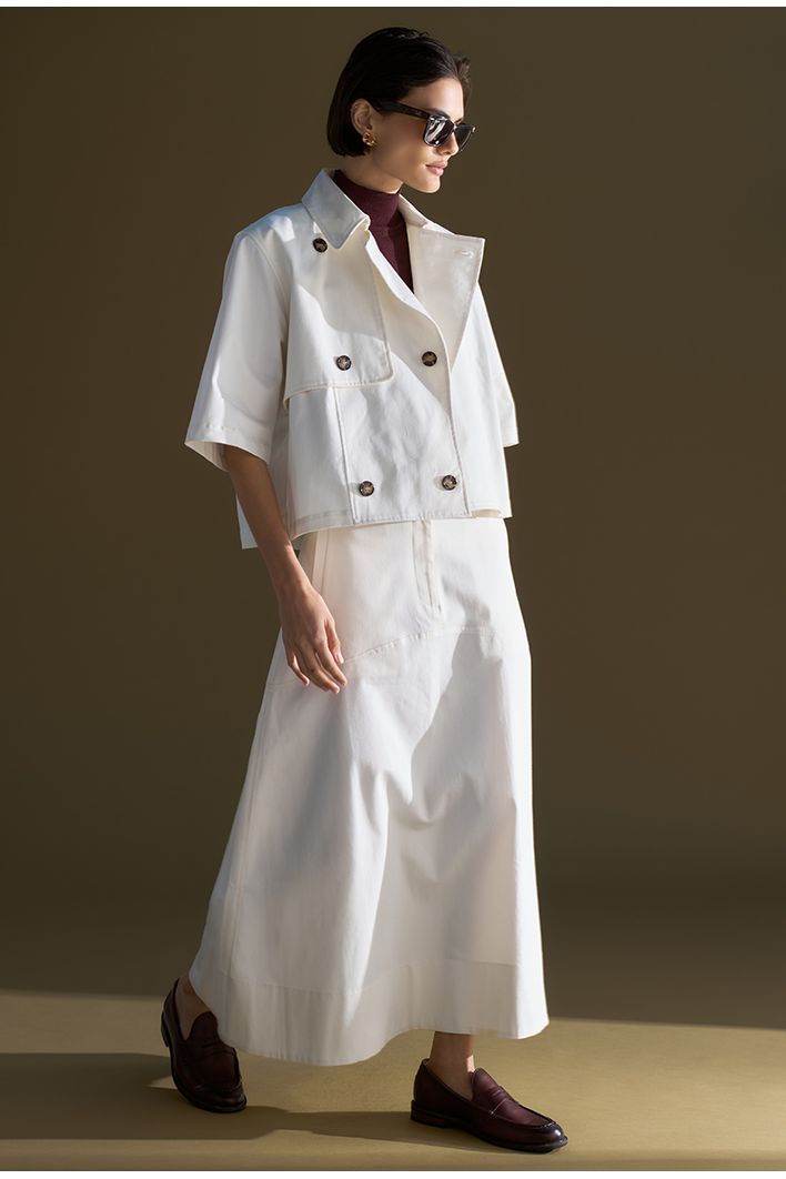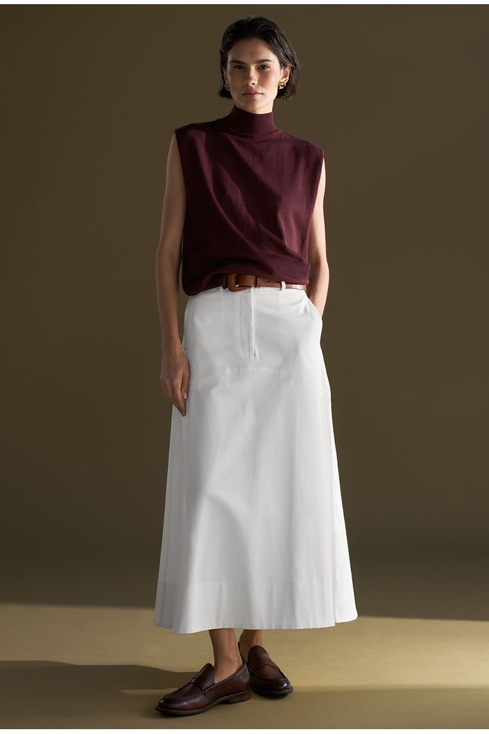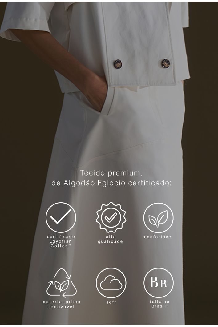 Saia Guam Midi em modelagem reta levemente evasê, confeccionada em algodão egípcio — fibra nobre reconhecida pela maciez, resistência e durabilidade — que garante toque suave e caimento estruturado. Possui recorte horizontal na altura do quadril, bolsos frontais funcionais e fechamento por zíper invisível. Versátil e atemporal, é perfeita para compor produções casuais ou sofisticadas, podendo ser combinada com camisas, tricôs ou camisetas para diferentes ocasiões.