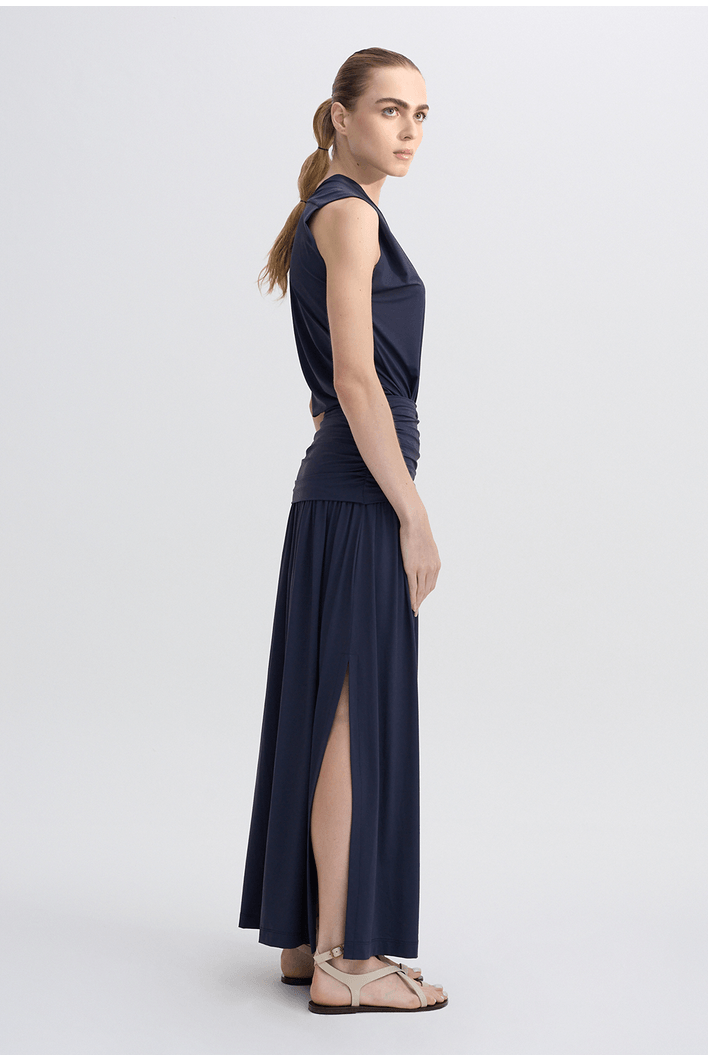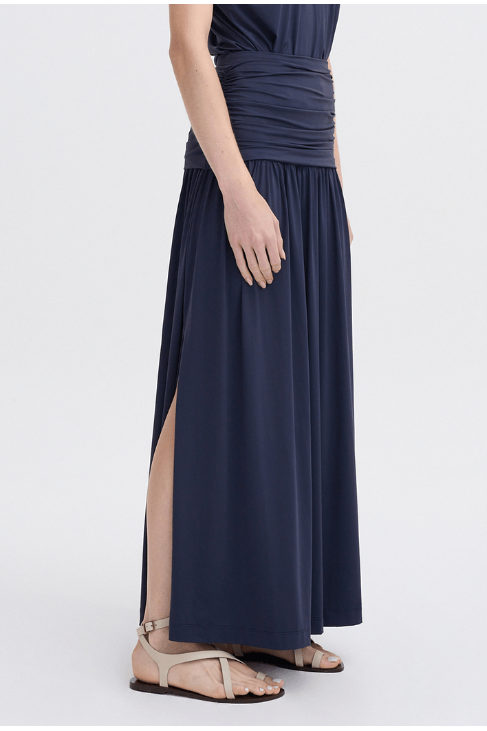 Saia longa de caimento fluido, com cintura franzida que valoriza a silhueta e garante conforto ao vestir. Possui fenda frontal que proporciona leveza ao movimento e um visual moderno. Peça versátil, ideal para composições elegantes ou casuais.