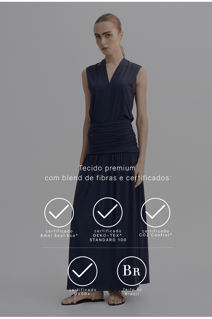 O tecido utilizado nesta peça, possui certificação OEKO-TEX Standard 100, Amni Soul Eco, UV Control e Co2 Control.