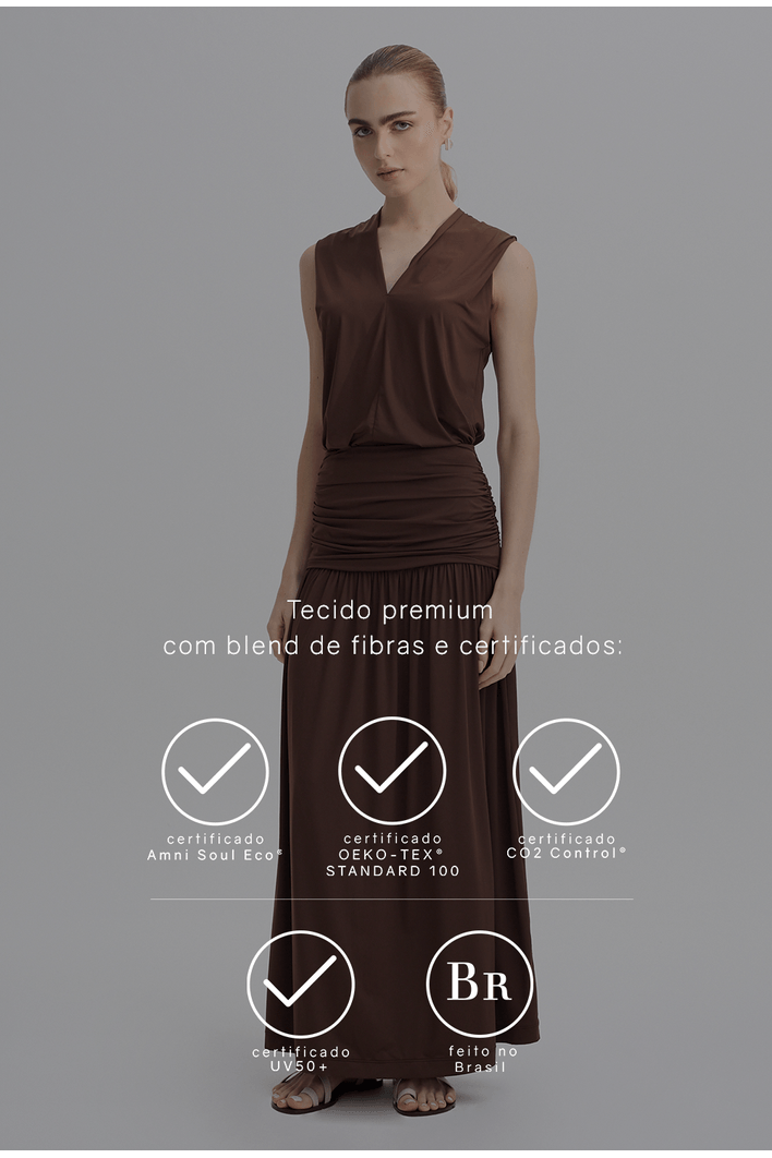 O tecido utilizado nesta peça, possui certificação OEKO-TEX Standard 100, Amni Soul Eco, UV Control e Co2 Control.