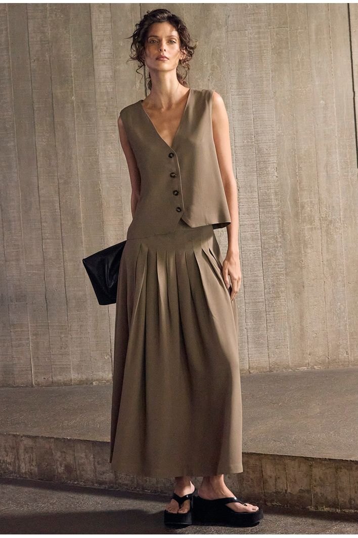 Com comprimento midi, essa saia proporciona elegância e versatilidade, alongando a silhueta e permitindo diferentes combinações. As pregas frontais adicionam movimento e charme, criando um balanço harmonioso a cada passo. Uma peça especial, ideal para quem busca qualidade, conforto e estilo atemporal.