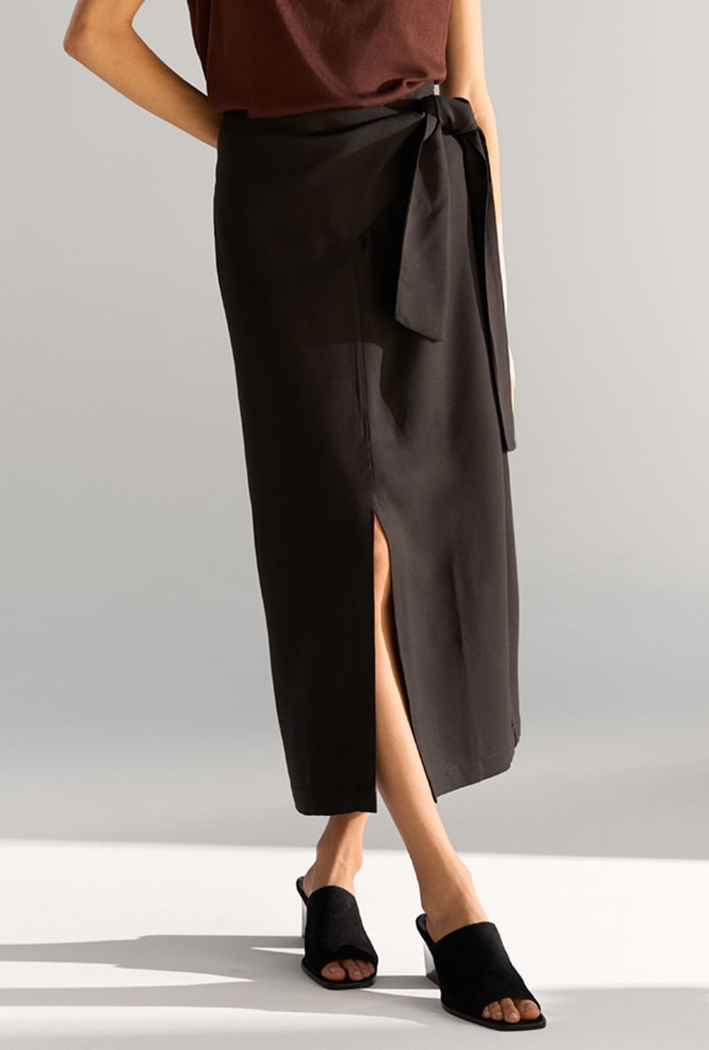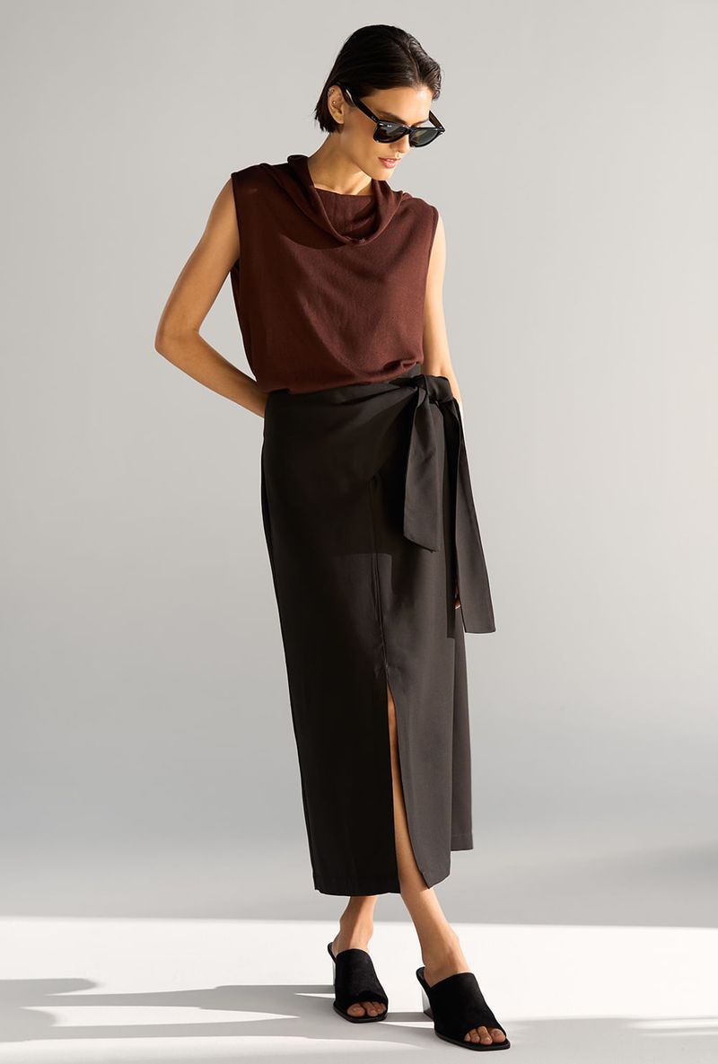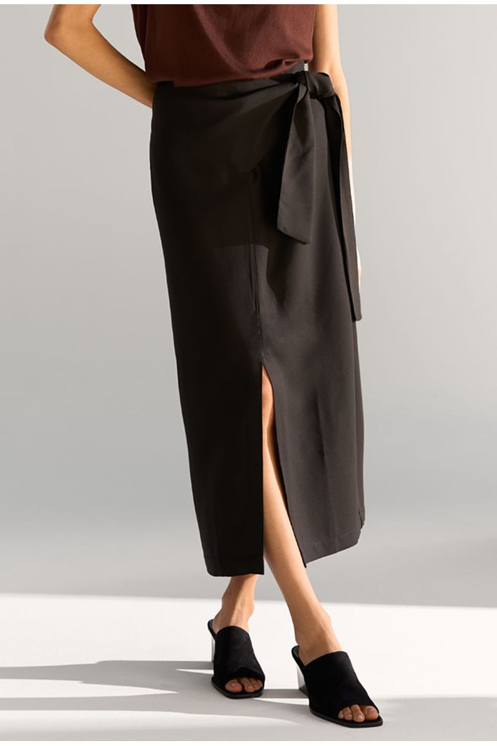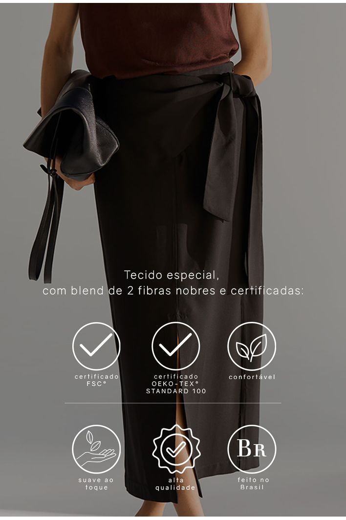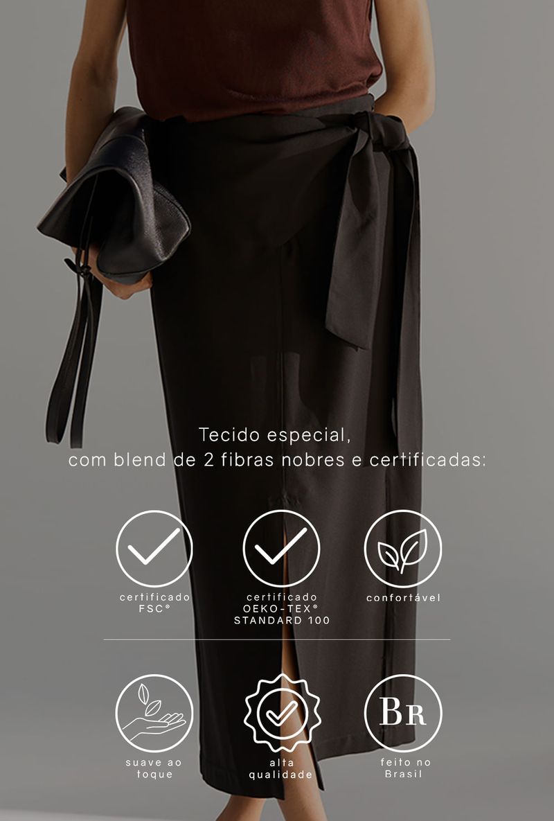 Saia midi com design elegante e contemporâneo, confeccionada em tecido Crepe Patou, que possui caimento leve e fluido. Possui modelagem transpassada com amarração lateral, criando um laço delicado que acrescenta charme e ajuste personalizado à peça. O comprimento midi e a fenda frontal conferem movimento e sofisticação, tornando-a versátil para compor desde produções casuais até looks mais formais.