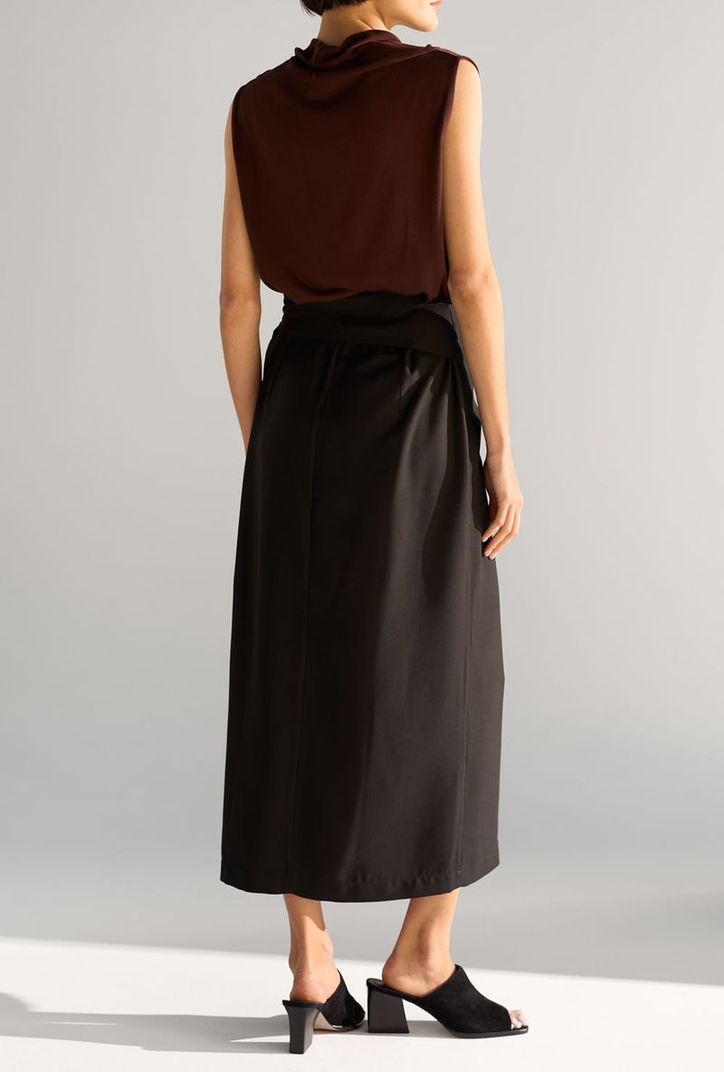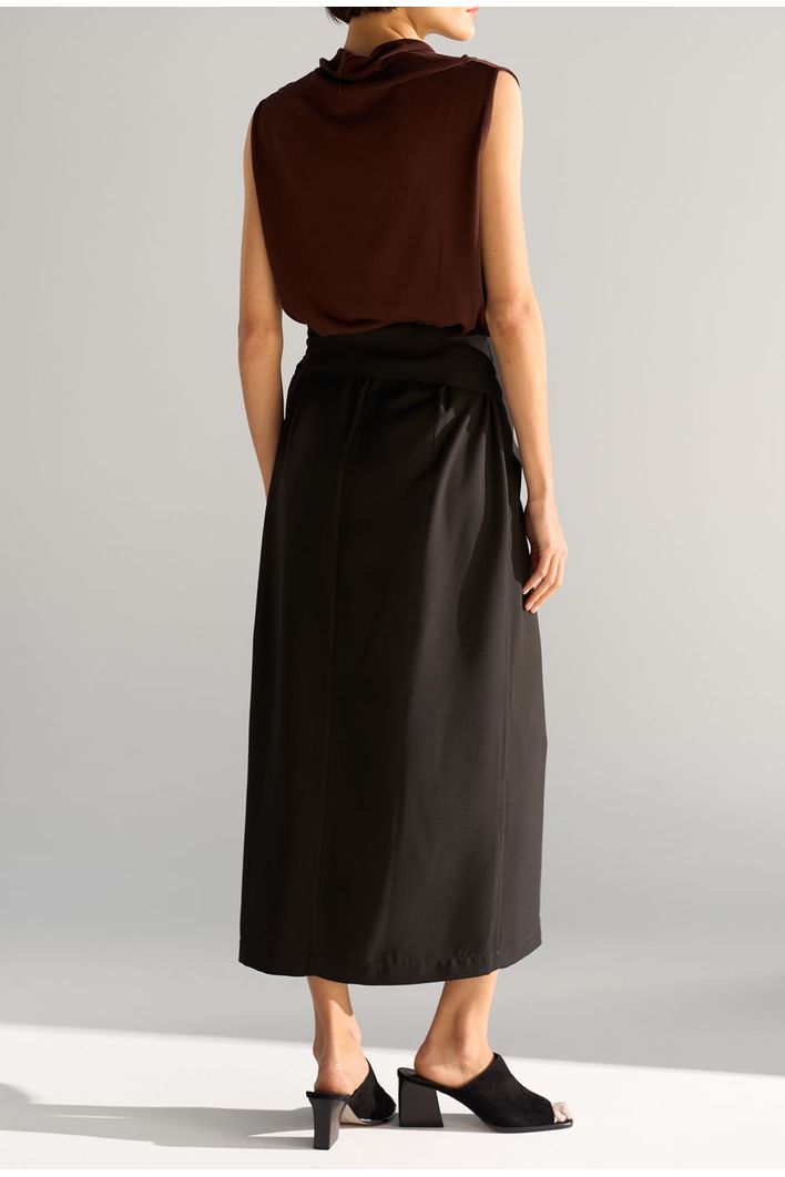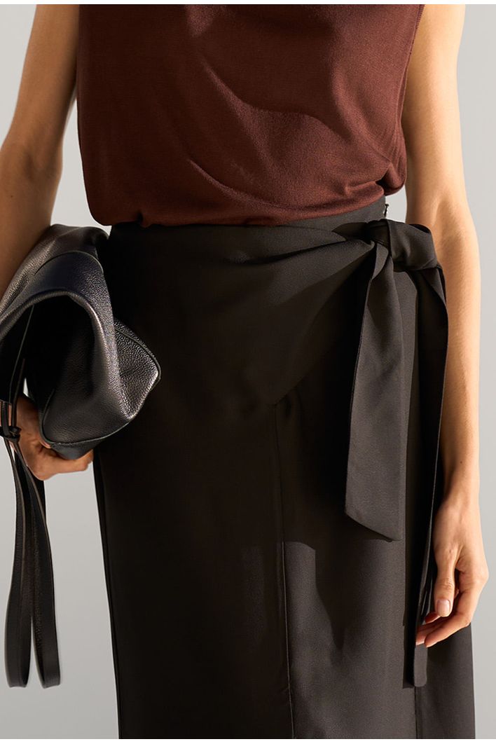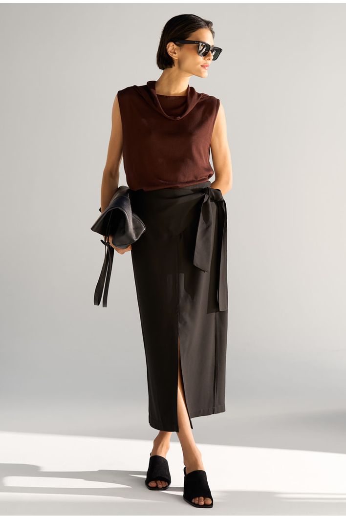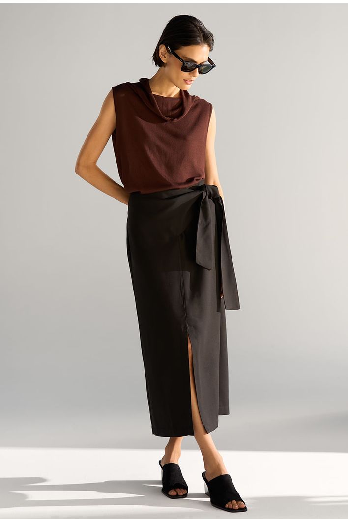 Saia midi com design elegante e contemporâneo, confeccionada em tecido Crepe Patou, que possui caimento leve e fluido. Possui modelagem transpassada com amarração lateral, criando um laço delicado que acrescenta charme e ajuste personalizado à peça. O comprimento midi e a fenda frontal conferem movimento e sofisticação, tornando-a versátil para compor desde produções casuais até looks mais formais.