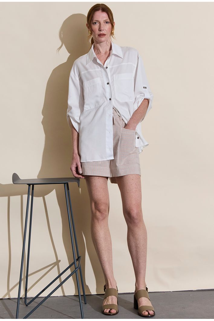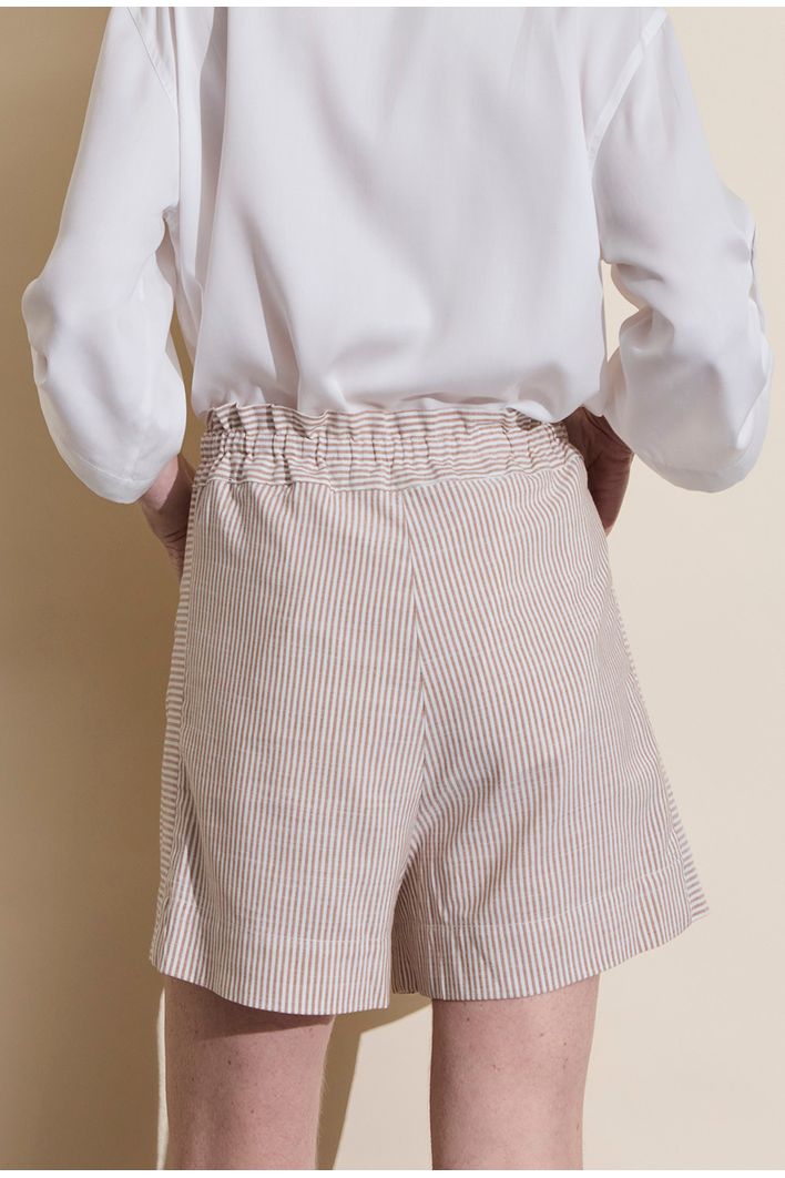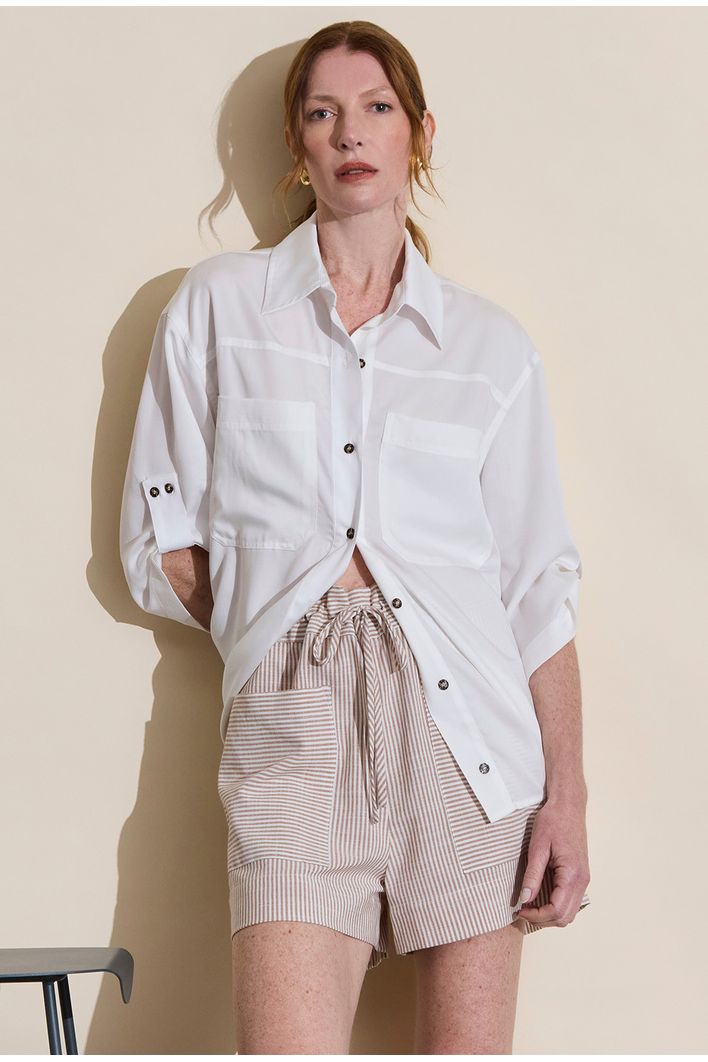 A peça conta com dois bolsos frontais, que unem funcionalidade e praticidade para o dia a dia. Na cintura, possui um rolote, tira fina de tecido que permite ajustar a peça com delicadeza. Já o elástico no cós traseiro proporciona maior flexibilidade e ajuste perfeito ao corpo, garantindo conforto para diferentes tipos de silhuetas.