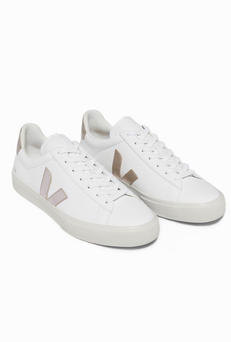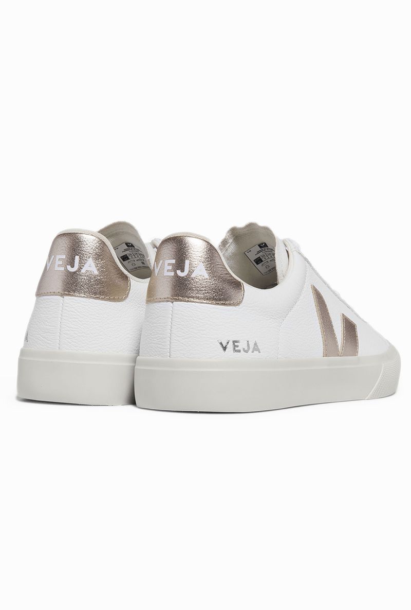 Com um visual clean e minimalista, o Campo é um tênis confeccionado em couro ChromeFree, a partir de couro livre de cromo, seguindo as recomendações e normas REACH: utilizando baixos níveis de produtos químicos e com uma atenção especial ao uso da água no processo de curtimento e em sua reciclagem. Os cadarços são produzidos em algodão orgânico. O logo VEJA é aplicado na lateral e feito de couro ChromeFree. O forro interno é confeccionado em poliéster feito a partir de garrafas PET recicladas. A palmilha é feita em EVA expandido com borracha. O solado é produzido a partir de borracha nativa da Amazônia, feita de acordo com os princípios do comércio justo, é vulcanizado por completo em todo o cabedal para trazer mais aderência a cada passo.