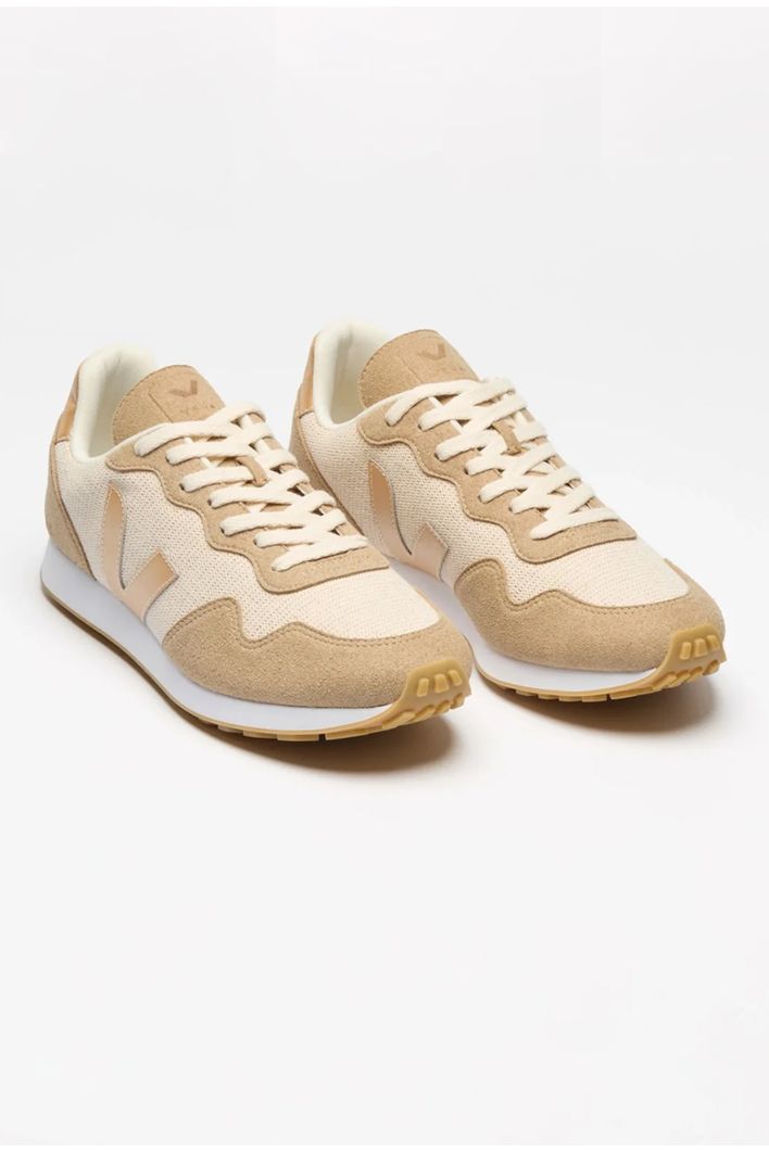 seu cabedal inovador é feito de J-Mesh (algodão e juta), um tecido resistente, leve e altamente respirável. Os detalhes em camurça vegana e o icônico "V" em lona revestida criam um visual neutro e sofisticado.