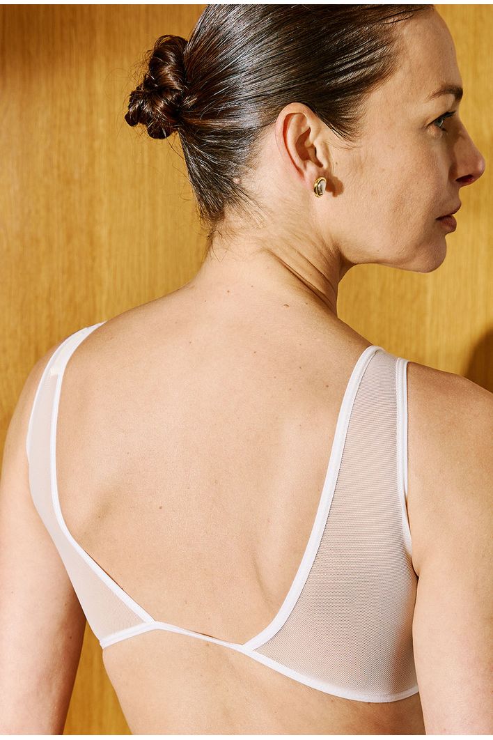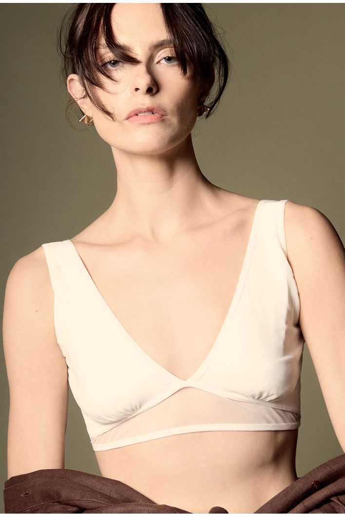 Top com design minimalista e sofisticado. Possui decote em “V” profundo, alças finas e detalhe em tule translúcido logo abaixo do busto, trazendo leveza e modernidade à peça. Confeccionado em tecido leve e confortável e com caimento leve e delicado que permite sobreposições versáteis, tornando-o perfeito tanto para produções noturnas quanto para looks contemporâneos no dia a dia.