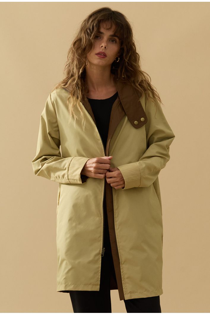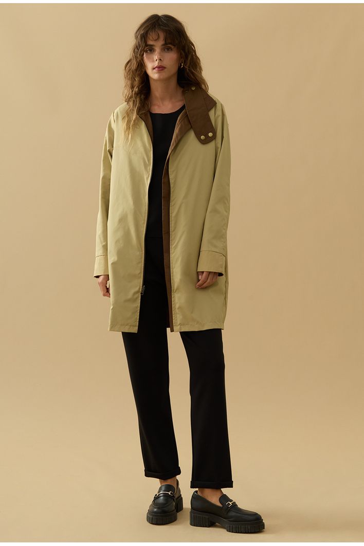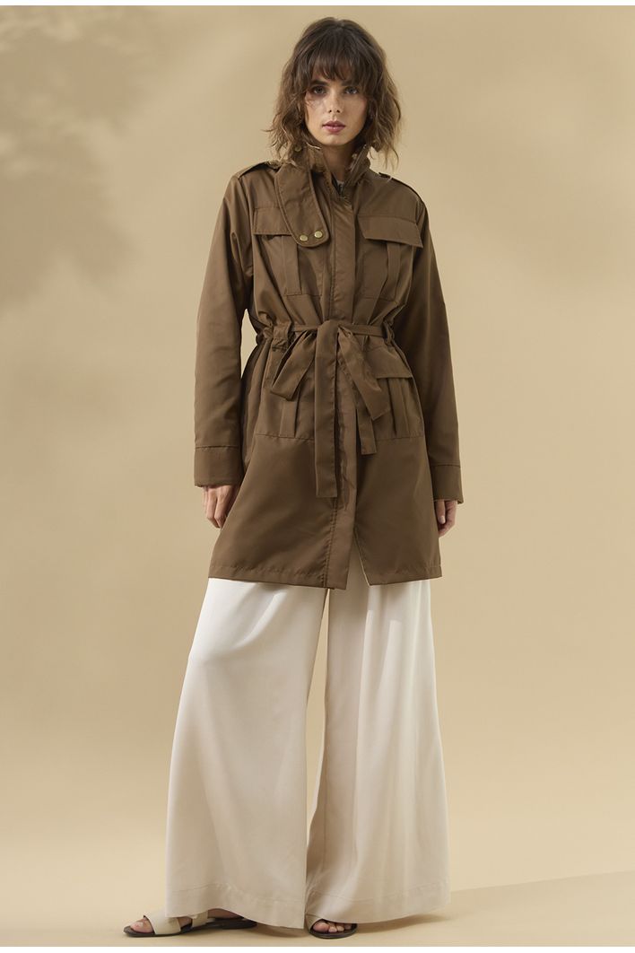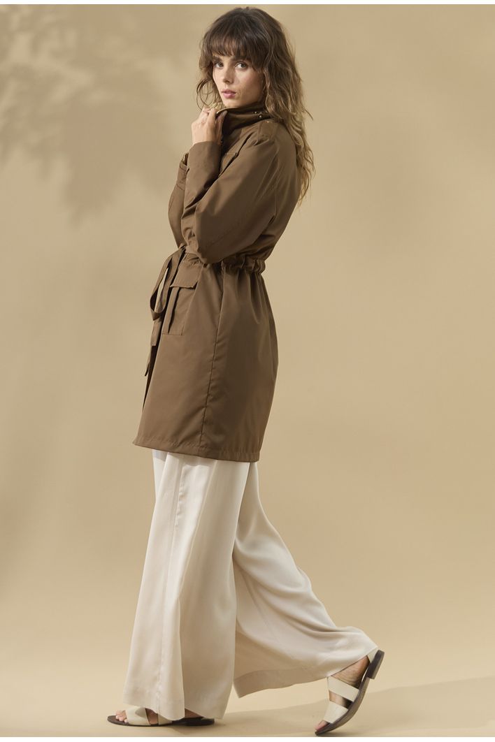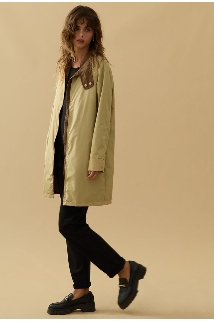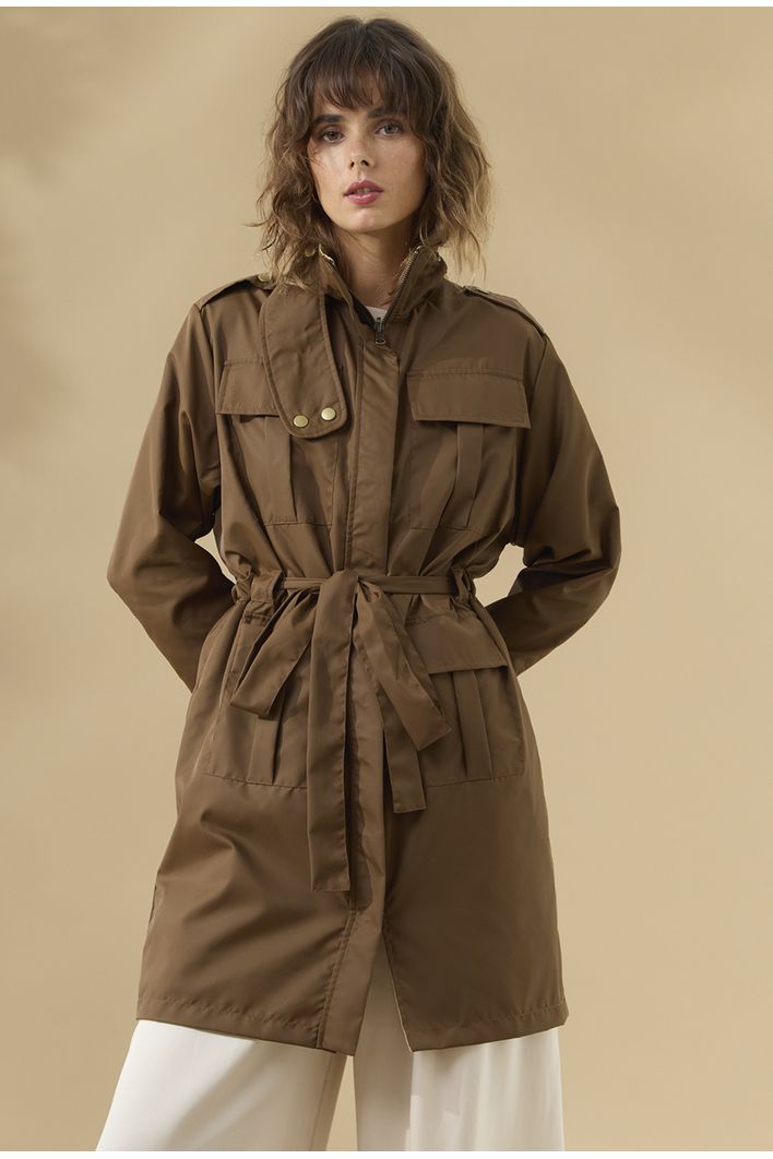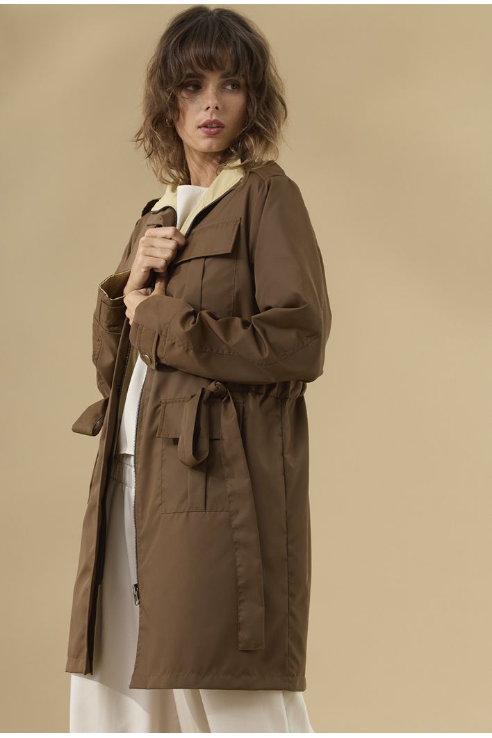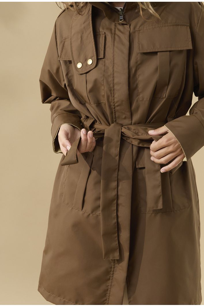 O Trench Emae é a união perfeita entre funcionalidade e elegância. Sua modelagem dupla face permite transitar entre dois tons sofisticados – bege e marrom*–, garantindo versatilidade para diferentes composições. A face principal se destaca pelos bolsos estratégicos na altura do busto e da cintura, além de passantes e uma faixa para amarração que valoriza a silhueta. Já a face interna, minimalista e lisa, conta com bolso faca lateral, mantendo a praticidade sem perder a sofisticação.