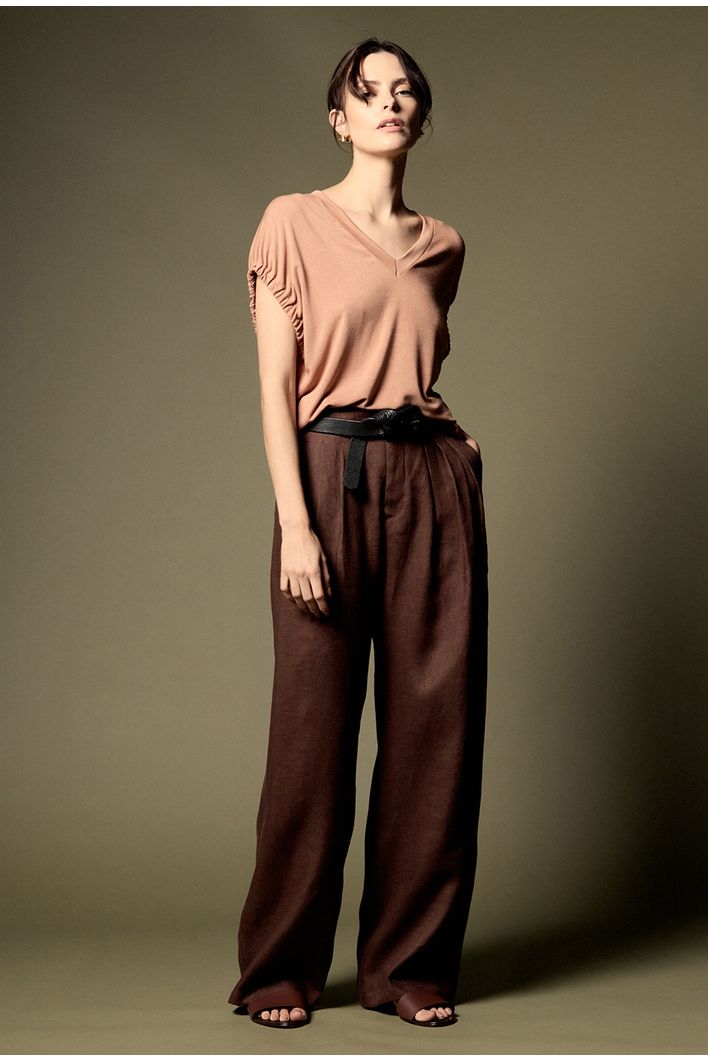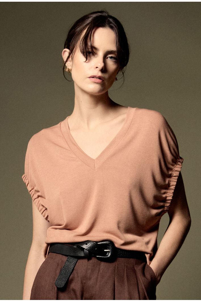 Confeccionada em modal, um tecido especial que combina tecnologia e sustentabilidade, esta blusa oferece um toque luxuoso e suavidade incomparável. O modal é uma fibra inovadora derivada da celulose de árvores de faia, conhecida por ser altamente respirável e ecologicamente responsável. Além de ser supermacio, o modal é durável e resistente a encolhimentos, o que garante que a peça mantenha seu caimento impecável por muito mais tempo. As mangas franzidas adicionam um toque delicado e diferenciado ao modelo, trazendo feminilidade e movimento. Já a gola em V valoriza o colo, alongando visualmente o pescoço e conferindo elegância ao look. A Blusa Carmathia é perfeita para quem busca uma peça prática, sofisticada e confortável.