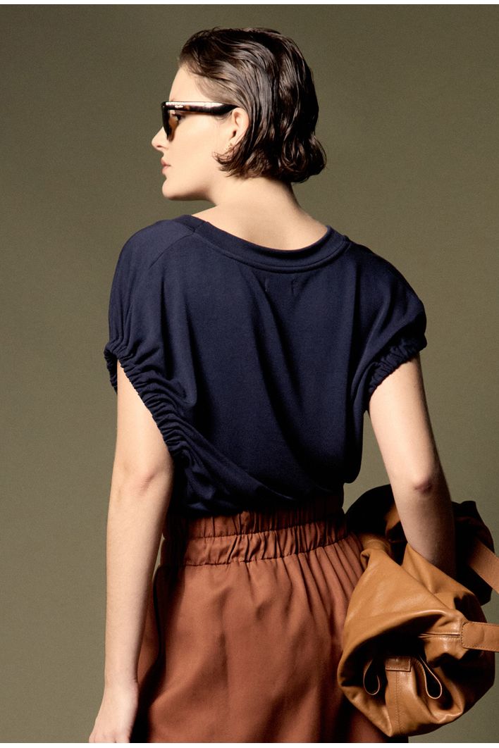 Confeccionada em modal, um tecido especial que combina tecnologia e sustentabilidade, esta blusa oferece um toque luxuoso e suavidade incomparável. O modal é uma fibra inovadora derivada da celulose de árvores de faia, conhecida por ser altamente respirável e ecologicamente responsável. Além de ser supermacio, o modal é durável e resistente a encolhimentos, o que garante que a peça mantenha seu caimento impecável por muito mais tempo.