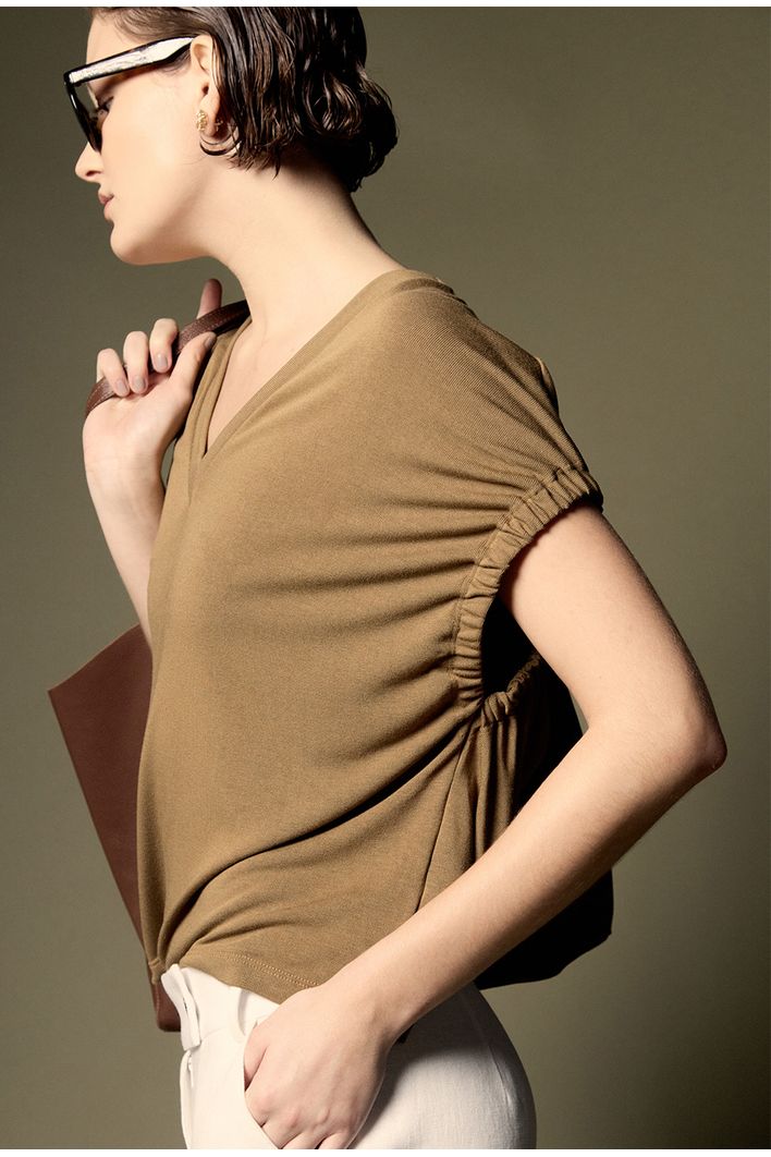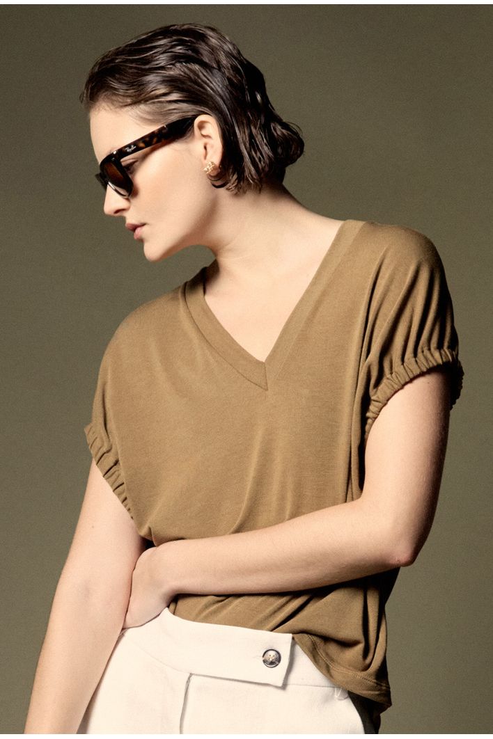 Confeccionada em modal, um tecido especial que combina tecnologia e sustentabilidade, esta blusa oferece um toque luxuoso e suavidade incomparável. O modal é uma fibra inovadora derivada da celulose de árvores de faia, conhecida por ser altamente respirável e ecologicamente responsável. Além de ser supermacio, o modal é durável e resistente a encolhimentos, o que garante que a peça mantenha seu caimento impecável por muito mais tempo. As mangas franzidas adicionam um toque delicado e diferenciado ao modelo, trazendo feminilidade e movimento. Já a gola em V valoriza o colo, alongando visualmente o pescoço e conferindo elegância ao look. A Blusa Carmathia é perfeita para quem busca uma peça prática, sofisticada e confortável.