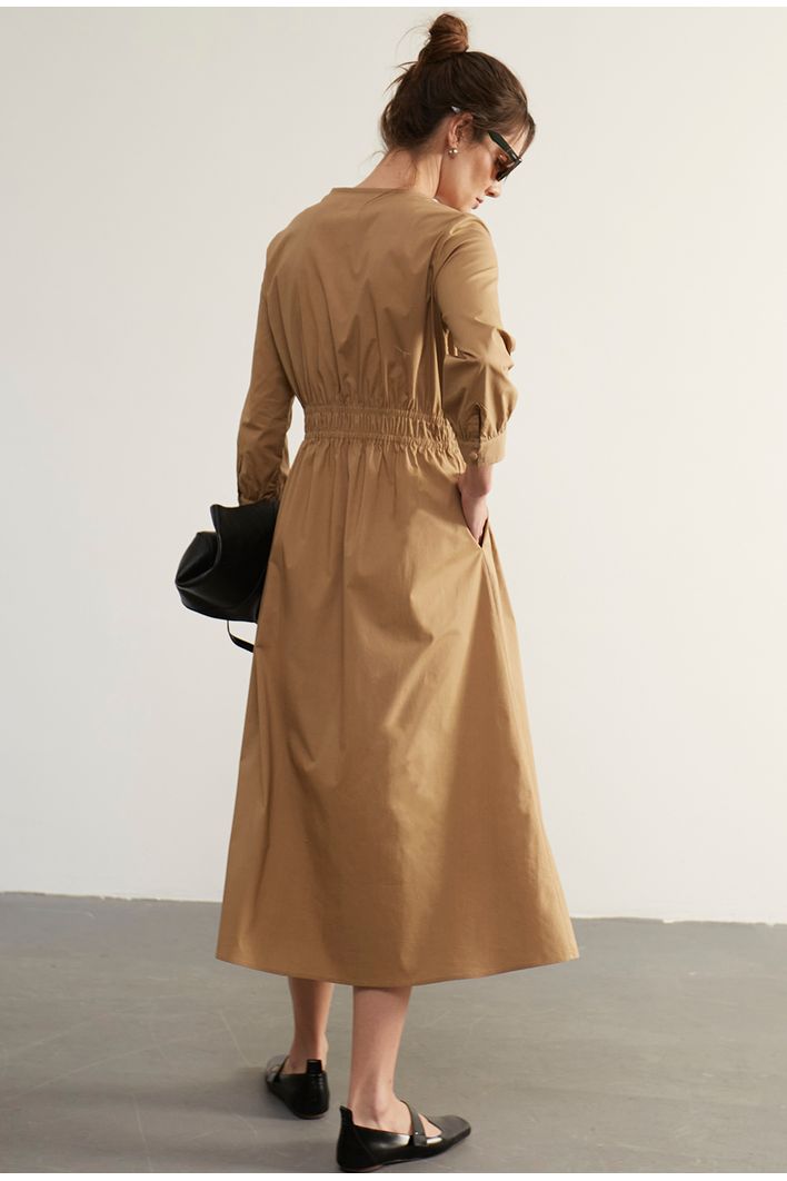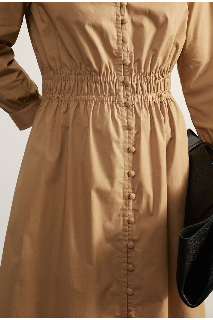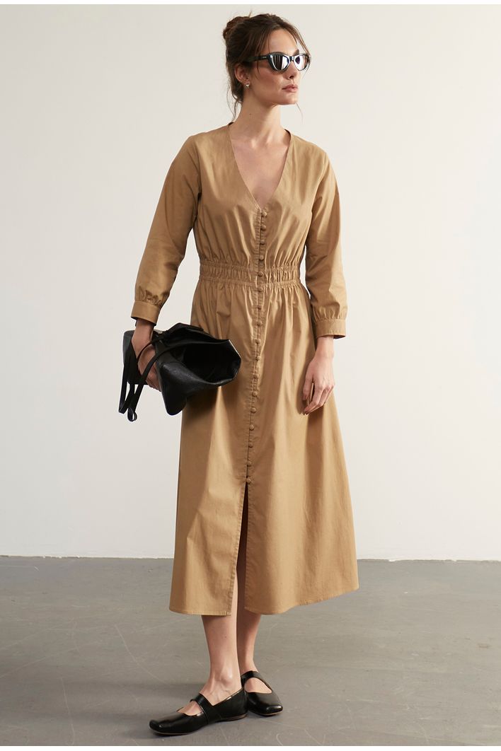 O vestido Cabrera é confeccionado em algodão de alta qualidade, oferecendo uma textura estruturada e durável. Seu comprimento midi é um destaque, conforto elegante e sofisticado — perfeito tanto para conforto casual quanto mais formais, equilibrando conforto e sofisticação. O midi também valoriza a silhueta, conferindo um ar clássico e ao mesmo tempo