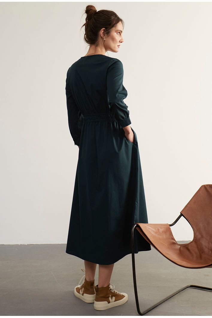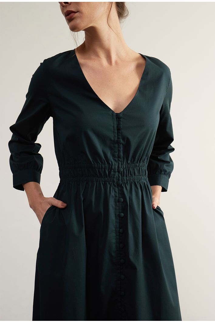 O vestido Cabrera é confeccionado em algodão de alta qualidade, oferecendo uma textura estruturada e durável. Seu comprimento midi é um destaque, conforto elegante e sofisticado — perfeito tanto para conforto casual quanto mais formais, equilibrando conforto e sofisticação. O midi também valoriza a silhueta, conferindo um ar clássico e ao mesmo tempo