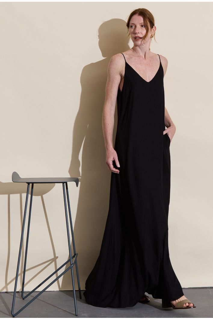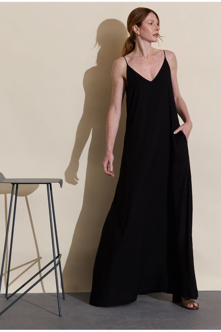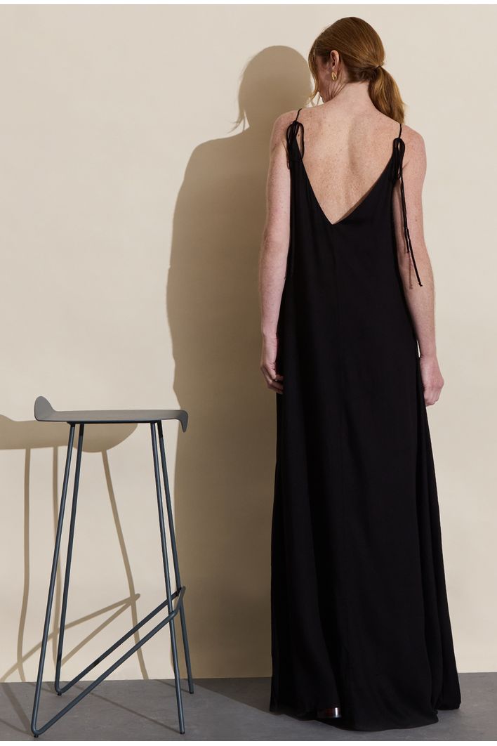 Confeccionado em 100% viscose, um tecido leve e fluido que proporciona excelente caimento e conforto. Este vestido longo destaca-se pelo seu lindo movimento, transmitindo elegância em cada detalhe. As alças ajustáveis, que se prendem em delicados laços, permitem personalização e adicionam um charme especial. O decote frontal e traseiro em V, com parte das costas aparentes, confere leveza e sofisticação ao visual. Uma peça sóbria, mas extremamente especial e refinada.
