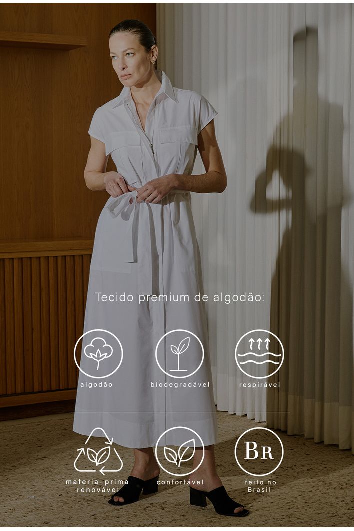 Com linhas puras e atemporais, este vestido traduz a essência do design minimalista da MyBasic. A silhueta fluida, marcada pelo cinto do mesmo tecido, cria um equilíbrio entre estrutura e leveza. A gola clássica e os bolsos utilitários reforçam o estilo contemporâneo, enquanto o tecido leve proporciona conforto e movimento natural. Uma peça versátil que transita com facilidade entre o dia e a noite, combinando elegância despretensiosa e propósito em cada detalhe.