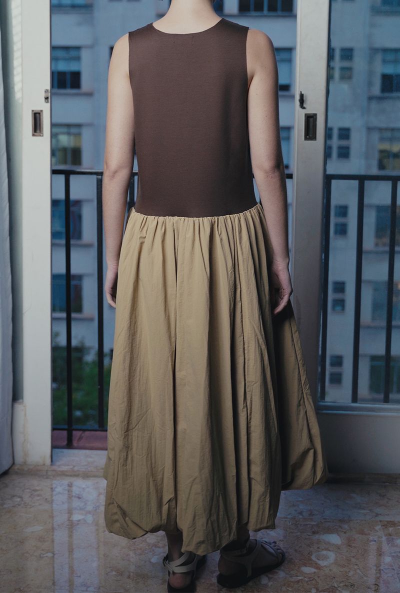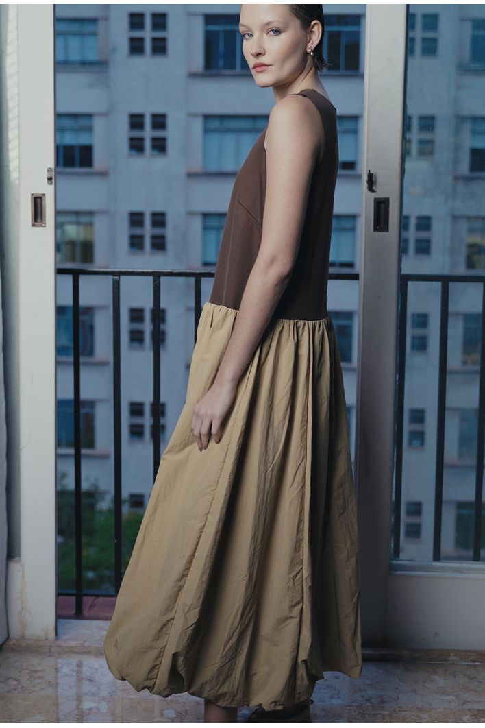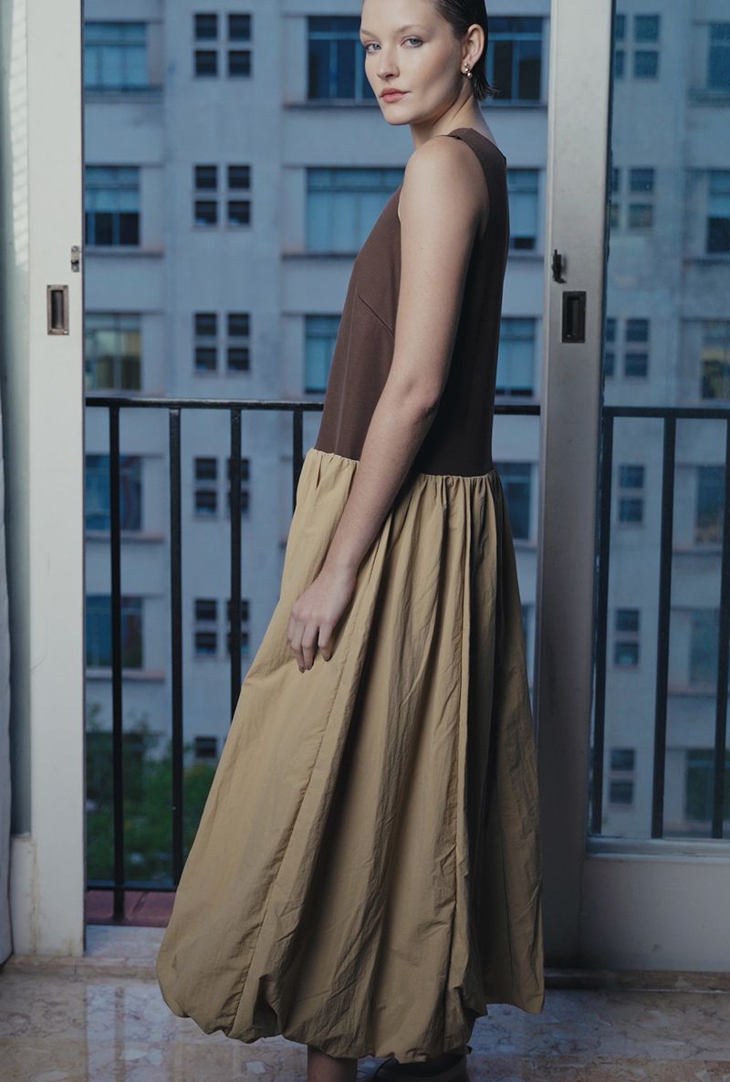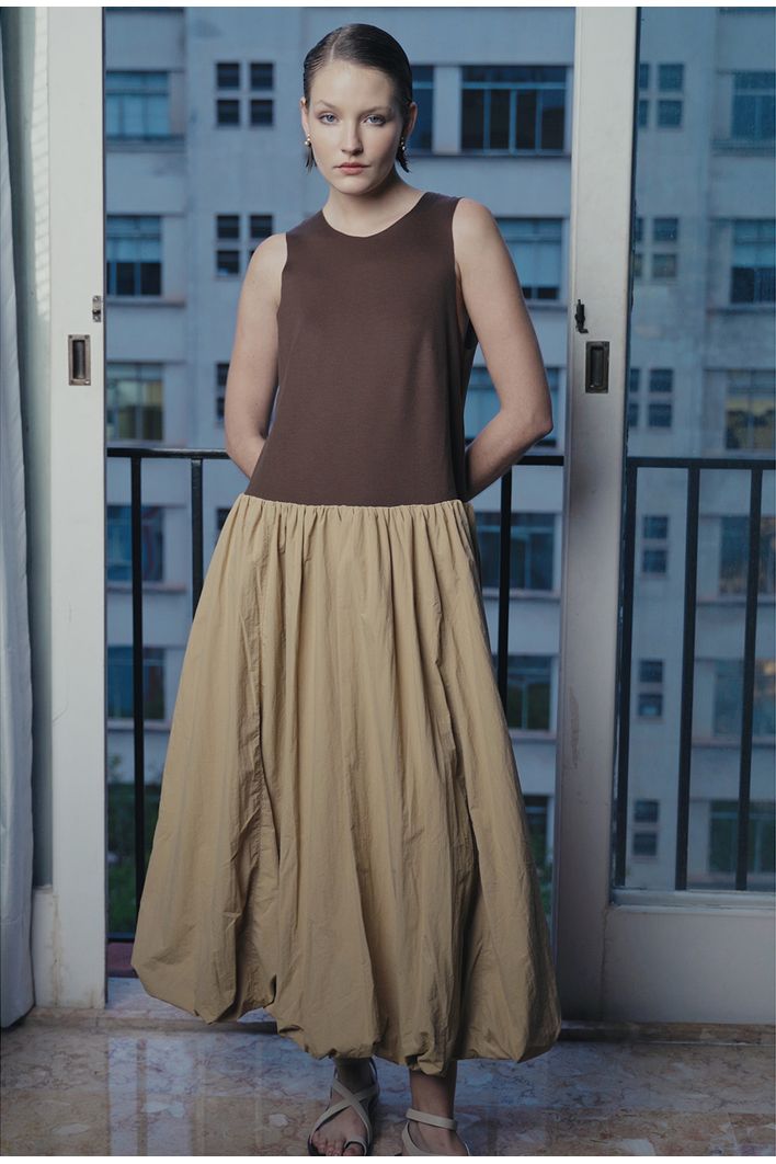 Com design contemporâneo, este vestido une elegância e conforto em uma única peça. o corpo estruturado valoriza a silhueta com sofisticação, enquanto a saia ampla e fluida cria movimento e leveza. Ideal para quem busca um visual moderno e autoral, ele transita com facilidade entre produções casuais e ocasiões especiais. Combine com sandálias minimalistas ou acessórios marcantes para um look cheio de personalidade.