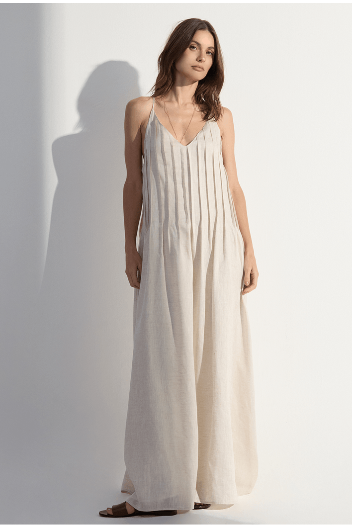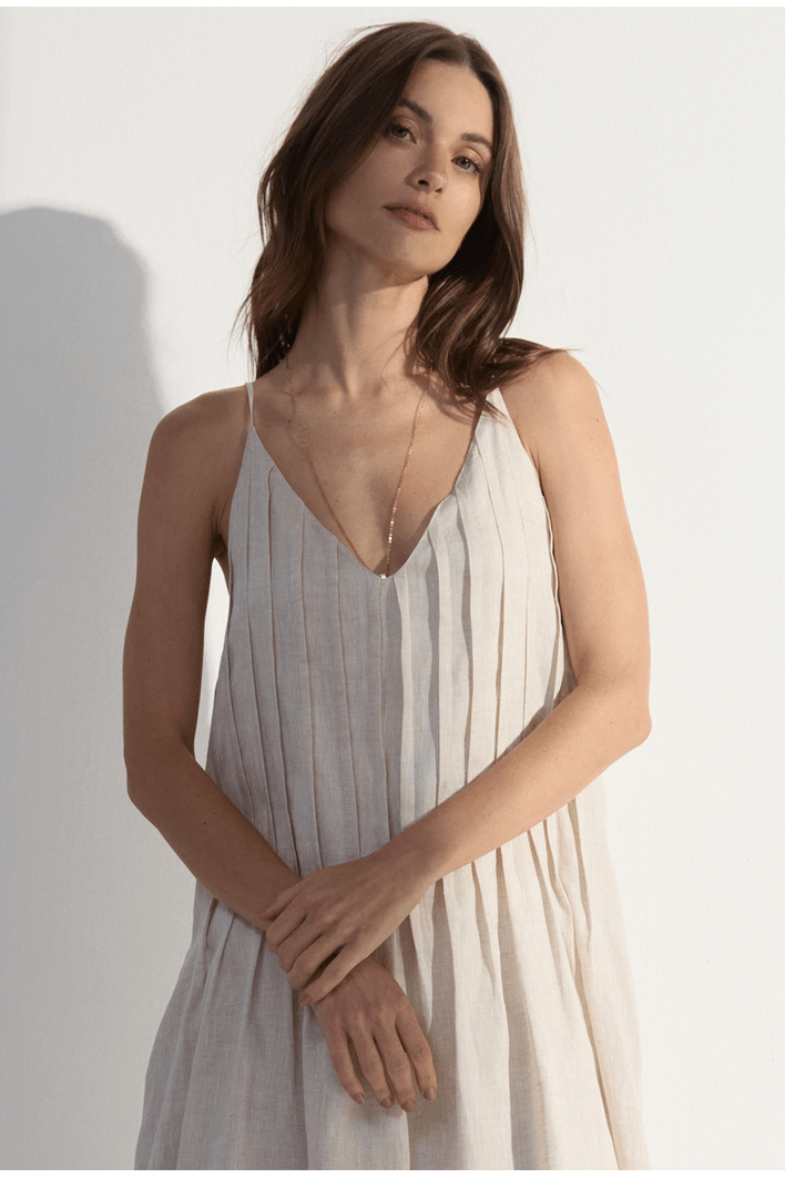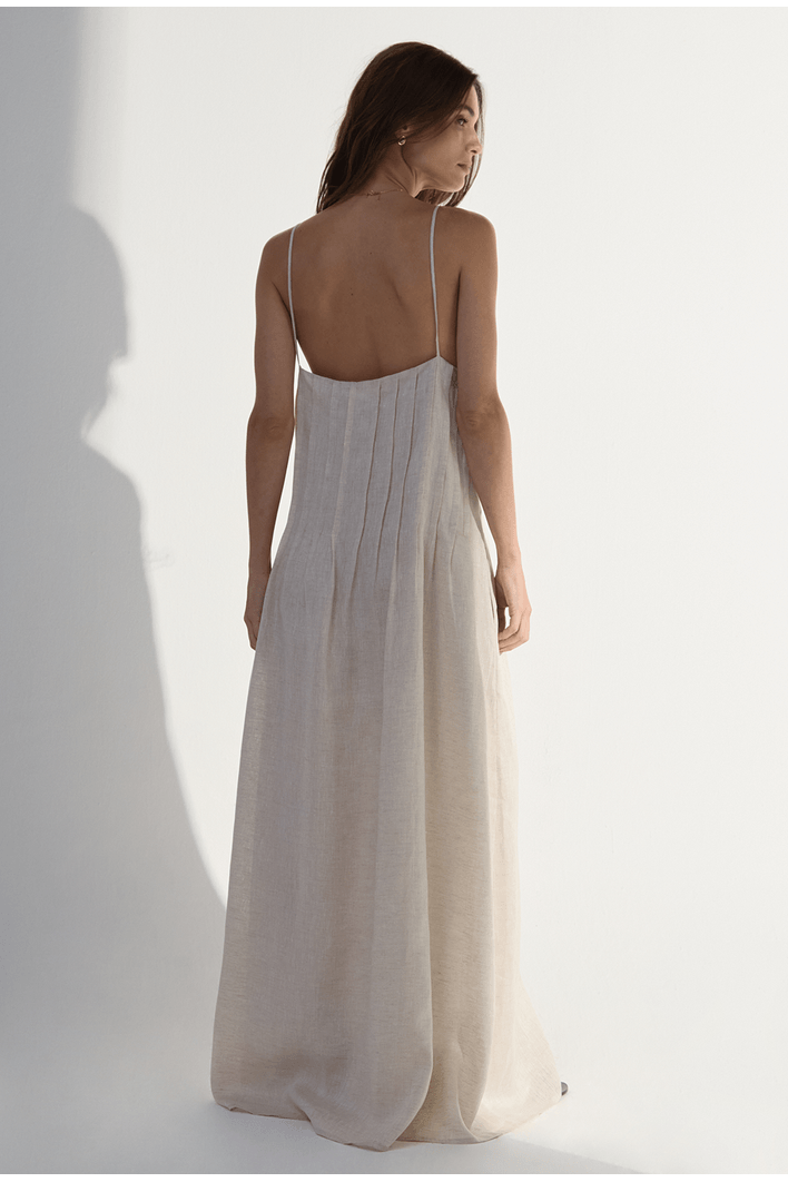 Com design minimalista e toque natural, este vestido midi em linho traduz elegância leve e contemporânea. As alças finas e o decote em “V” valorizam o colo, enquanto as pregas frontais criam um caimento fluido e delicado que realça a silhueta sem abrir mão do conforto. O tecido de fibra natural garante respirabilidade e frescor, tornando a peça ideal para dias ensolarados e ocasiões que pedem um visual sofisticado com naturalidade. Combine com sandálias, rasteiras ou acessórios em tons neutros para um look despretensiosamente elegante.