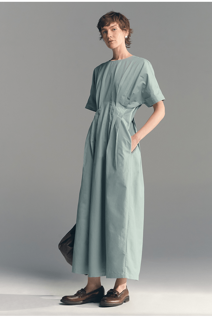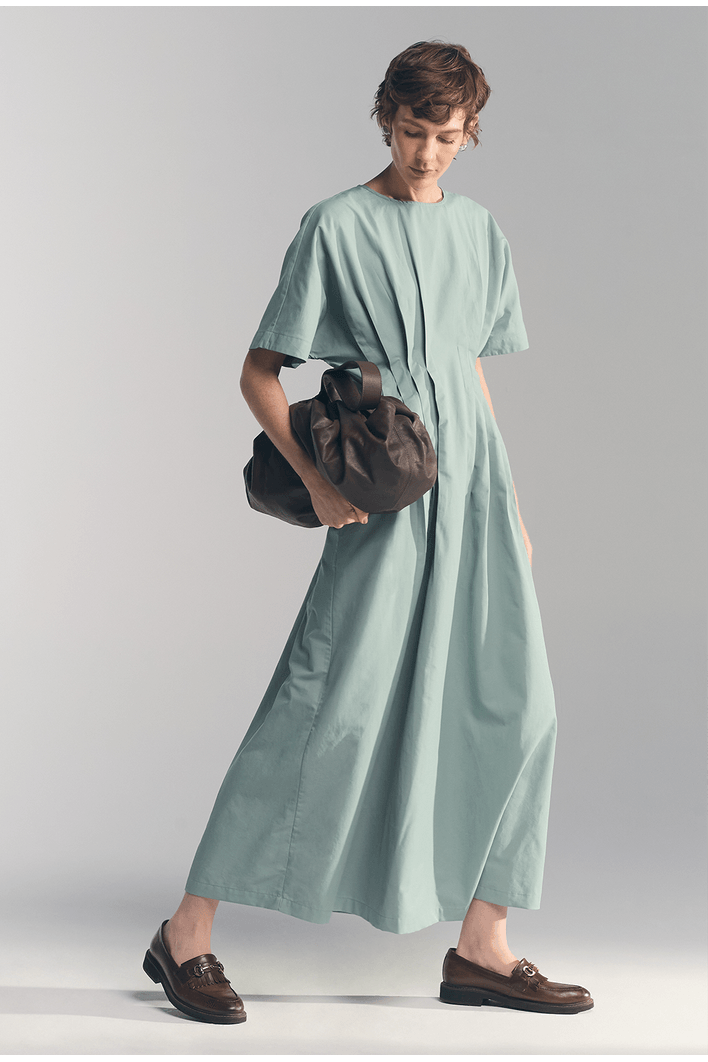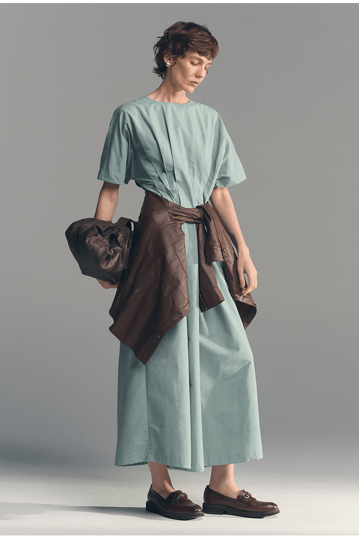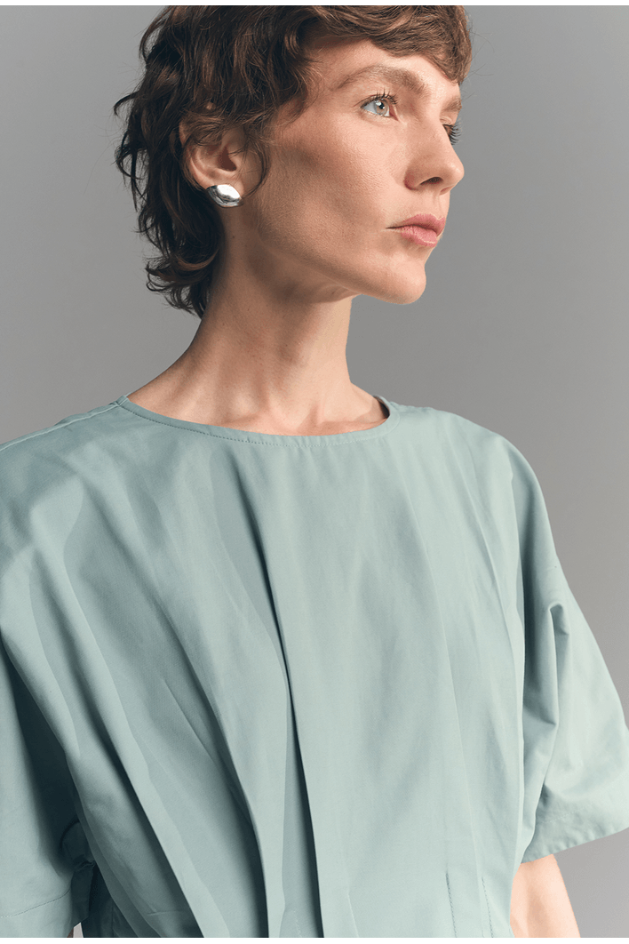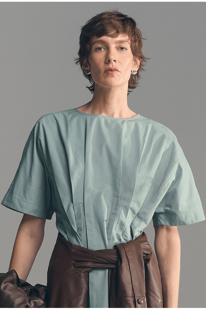 Seu destaque está nas pregas frontais que percorrem o centro da peça, trazendo movimento e um acabamento refinado ao design. A modelagem mais solta proporciona leveza ao vestir, enquanto as mangas amplas acrescentam um toque moderno e equilibrado ao visual.