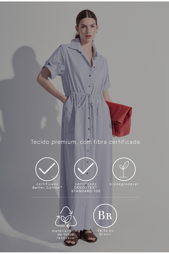 O tecido utilizado nesta peça possui certificação BCI (Better cotton initiative e OEKO-TEX Standard 100.