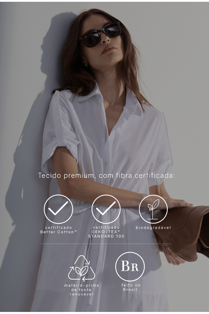 O tecido utilizado nesta peça possui certificação BCI (Better cotton initiative e OEKO-TEX Standard 100.