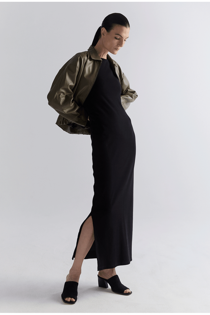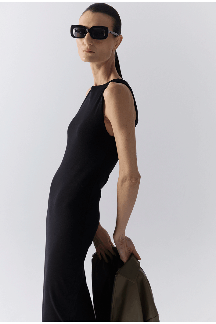 O vestido longo feminino é a definição de elegância minimalista com um toque contemporâneo. Com modelagem ajustada ao corpo, valoriza a silhueta de forma sofisticada, enquanto o comprimento alongado traz imponência ao visual.