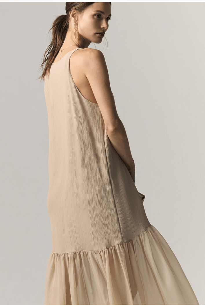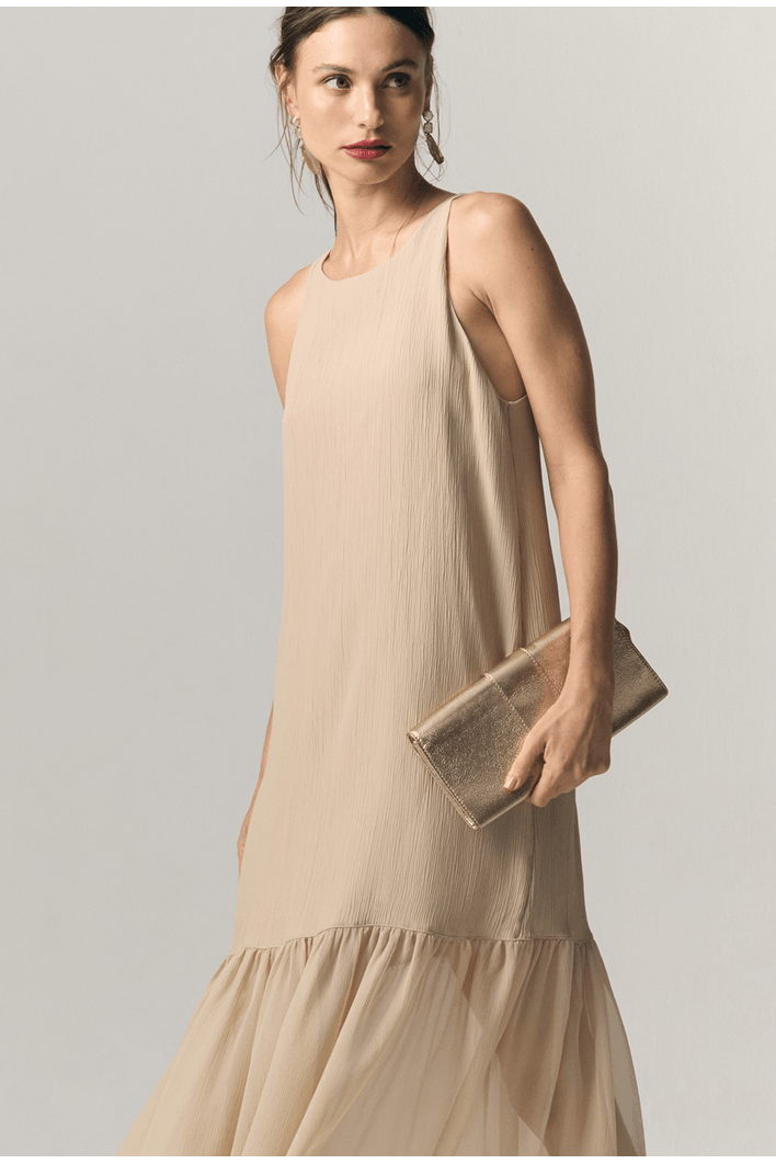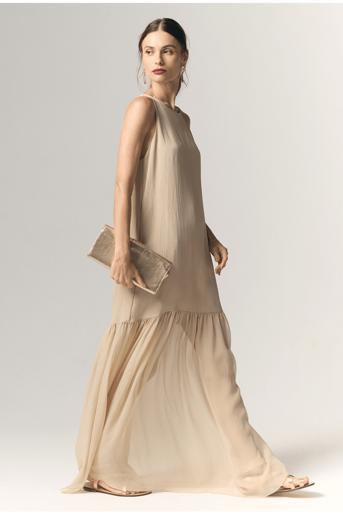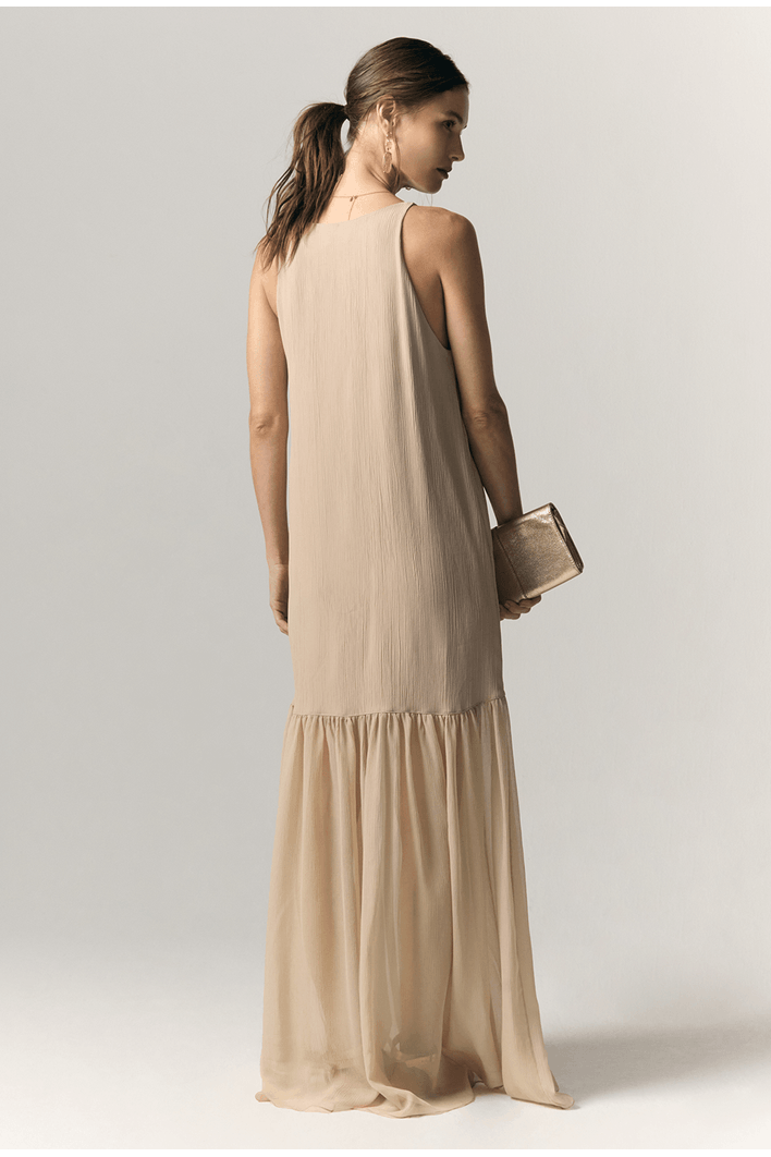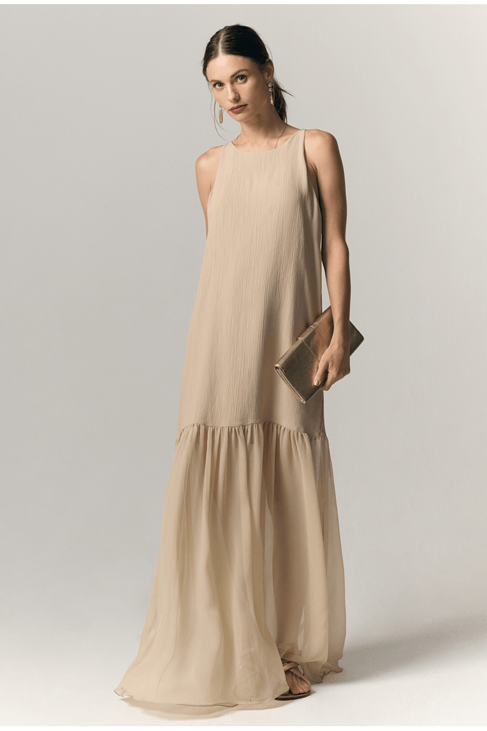 Este vestido longo combina leveza, elegância e um trabalho primoroso de construção têxtil. Seu design minimalista ganha profundidade e sofisticação graças ao mix de três tecidos diferentes, cada um contribuindo com textura, movimento e personalidade à peça.