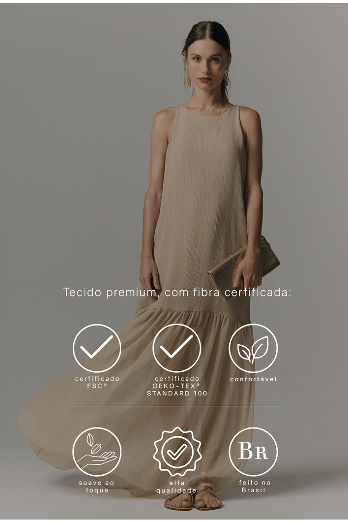 A parte superior é confeccionada em um tecido de toque macio, com caimento reto e estruturado. Essa composição cria uma silhueta alongada e elegante, valorizando o corpo sem marcar em excesso. Já a saia, feita em seda pura, traz fluidez natural, brilho sutil e movimento delicado a cada passo, proporcionando um contraste refinado com a parte superior. Por fim, o forro em viscose garante conforto absoluto, sensação agradável ao vestir e um caimento impecável.