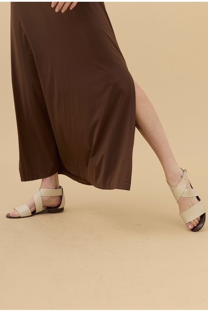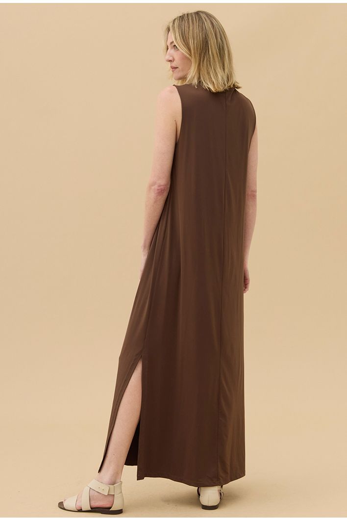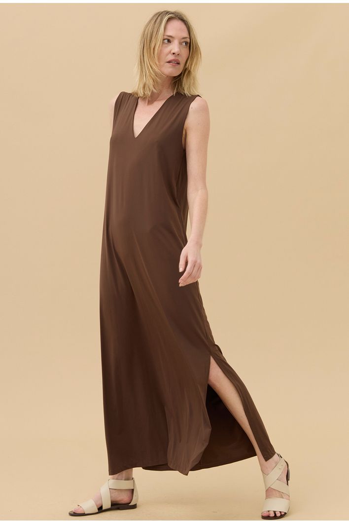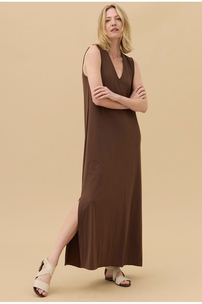 O design refinado se destaca pelo decote em V, que valoriza o colo e imprime sofisticação à silhueta, enquanto a modelagem longa e sem mangas equilibra leveza. As fendas laterais conferem movimento natural à peça, acompanhando os gestos com liberdade.